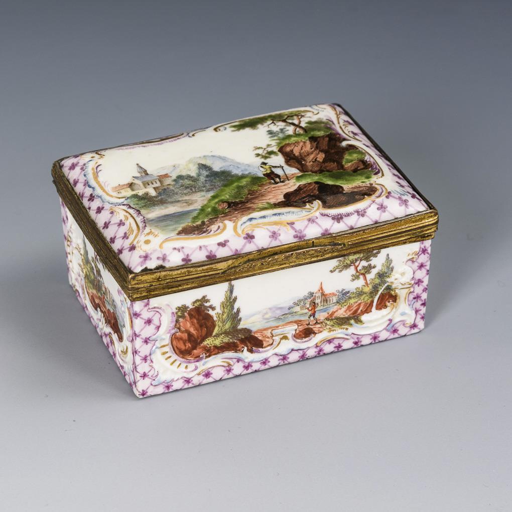 Rechteckige Dose mit feinem Rocaillerelief und ergänztem, im Stil der Dose bemaltem Deckel mit vergoldeter Metallmontierung. Purpurfarbenes Gitterwerk, in den Rocaillekartuschen fein gemalte Landschaften mit Architektur und Personenstaffage. 1 Lötstelle der Metallmontierung defekt, 1 Ecke bestoßen.