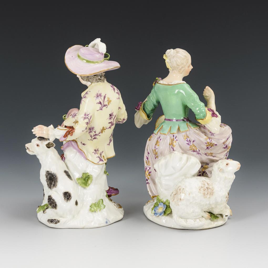 Auf einem Felssockel sitzende Schäferin mit Schaf bzw. Schäfer mit Hund. Restauriert, 1 Schafbein fehlt, Blüten und Blätter bestoßen.