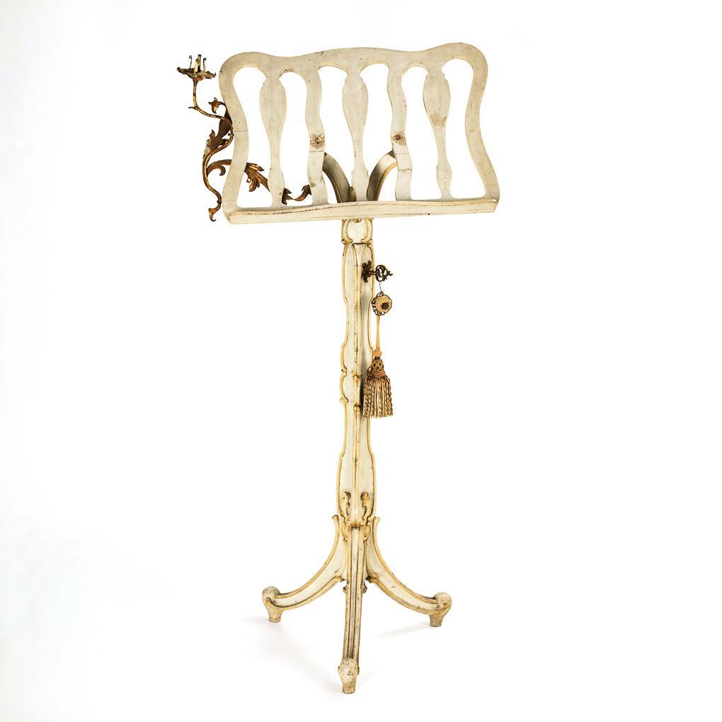Höhenverstellbarer, 3-beiniger Notenständer mit eisernem Blütenzweig als Kerzenhalter. Notenablage mit offenen Leimfugen und geringen Fehlstellen.
