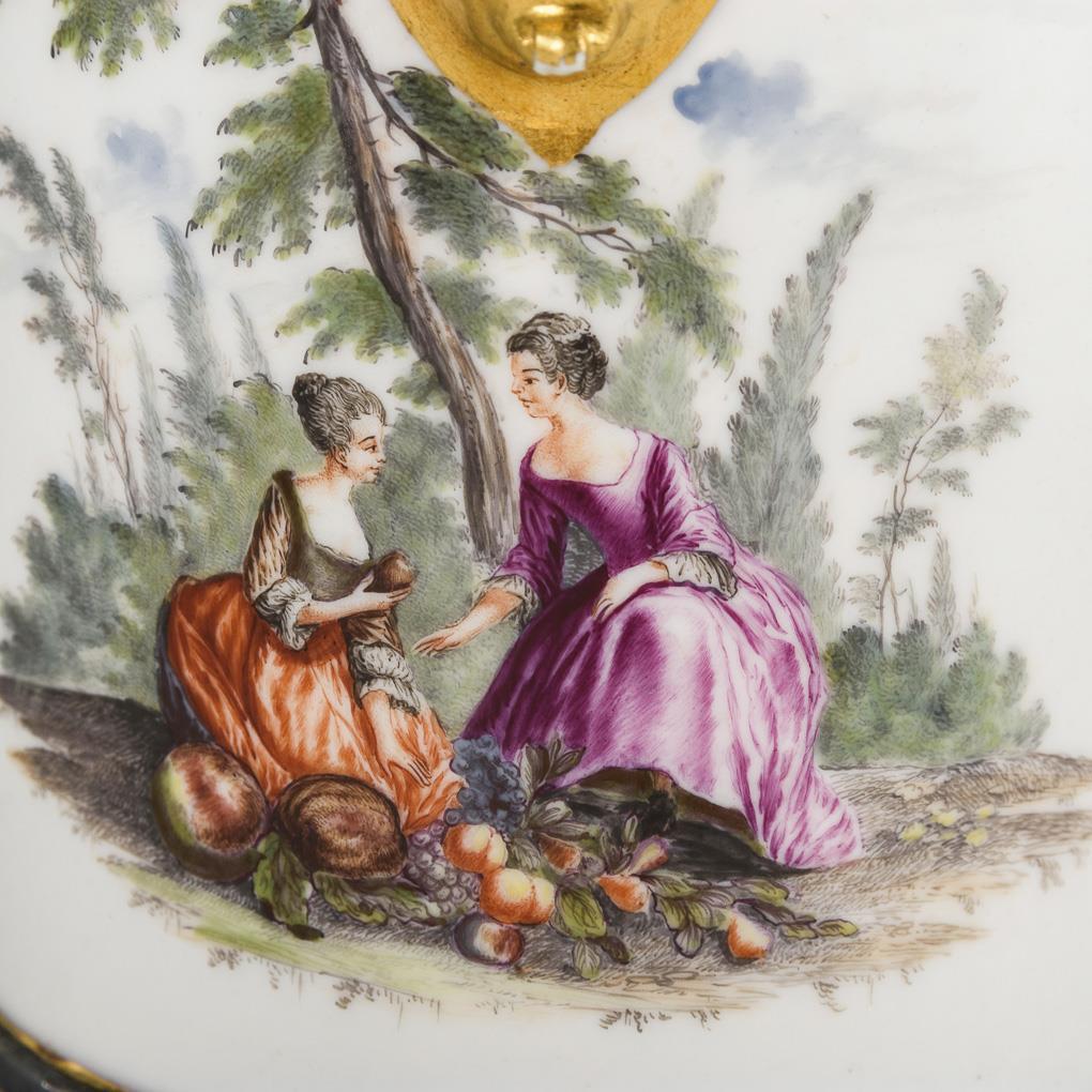 Zylinderkanne mit Röhrenausguss und seitlichem Stielansatz. Schauseitig die Darstellung zweier Rokokodamen vor einem Fruchtarrangement, verso eine Rokokodame mit einem Knaben in einer Parklandschaft. Ohne Deckel und Stiel, minimaler Goldabrieb.