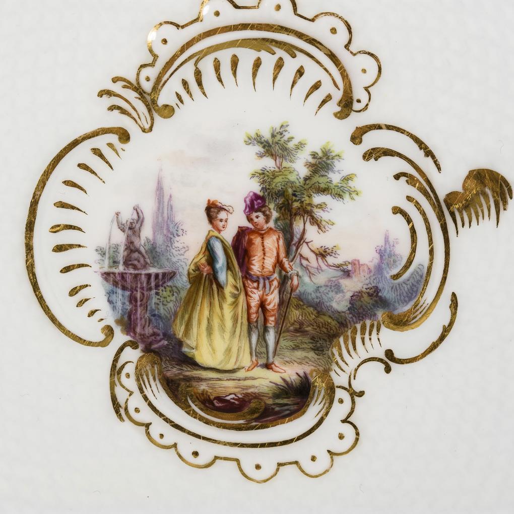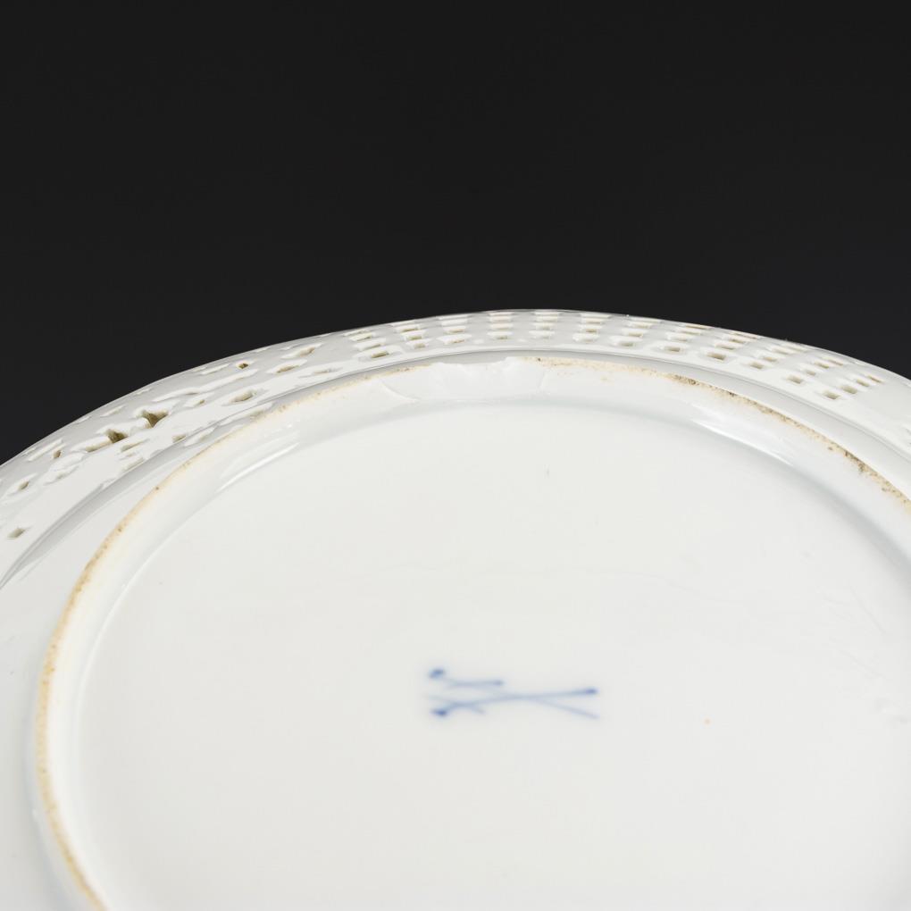 Teller mit Gitter- und Floraldurchbruch sowie Blütenrelief auf der Fahne. Im Spiegel eine kleine Vierpasskartusche mit der Darstellung eines galanten Paares in einer Landschaft. Ausbruch am Standring.