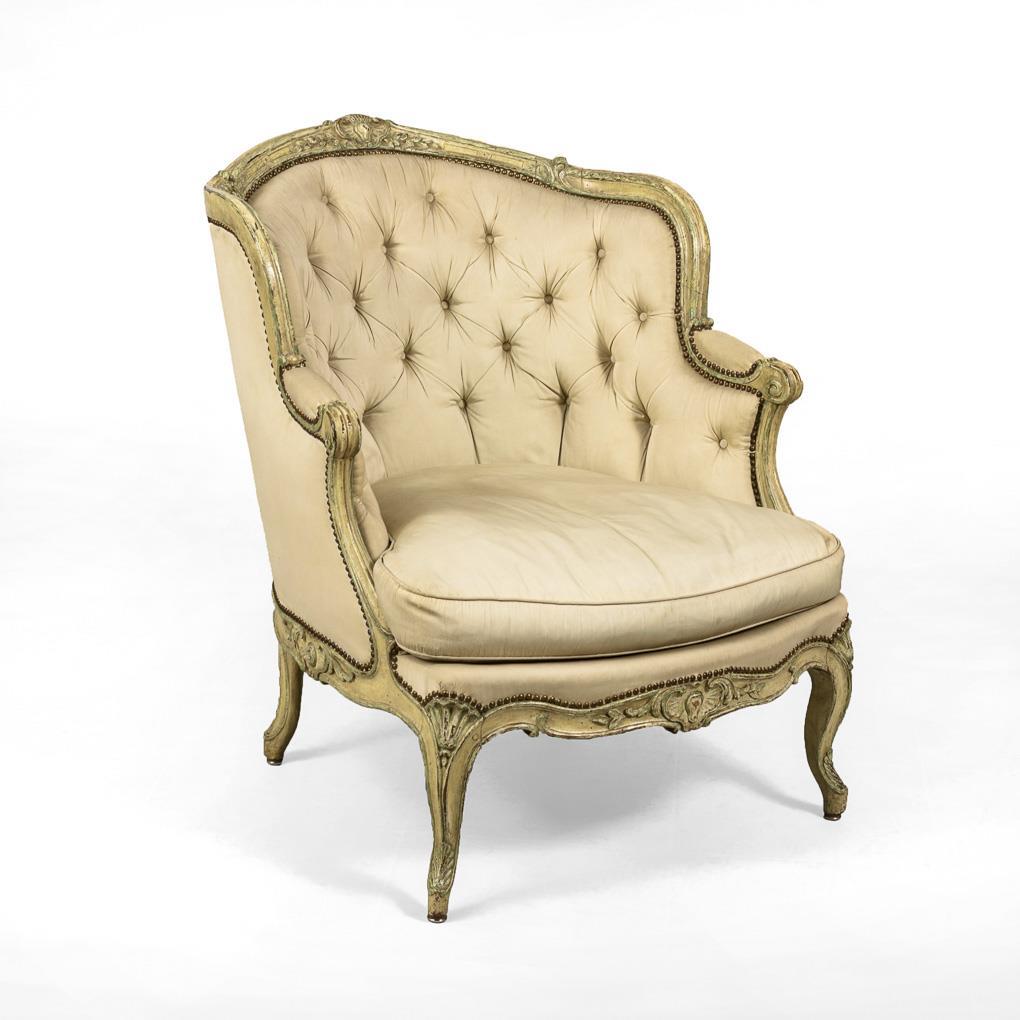 Ausladender stiltypisch geschwungener Barocksessel, verziert mit Rocaillenschnitzerei; gesteppter champagnerfarbener Bezug mit Ziernagelung. Farbfassung berieben, Alters-/Gebrauchsspuren, Polster und Bezug ergänzt.