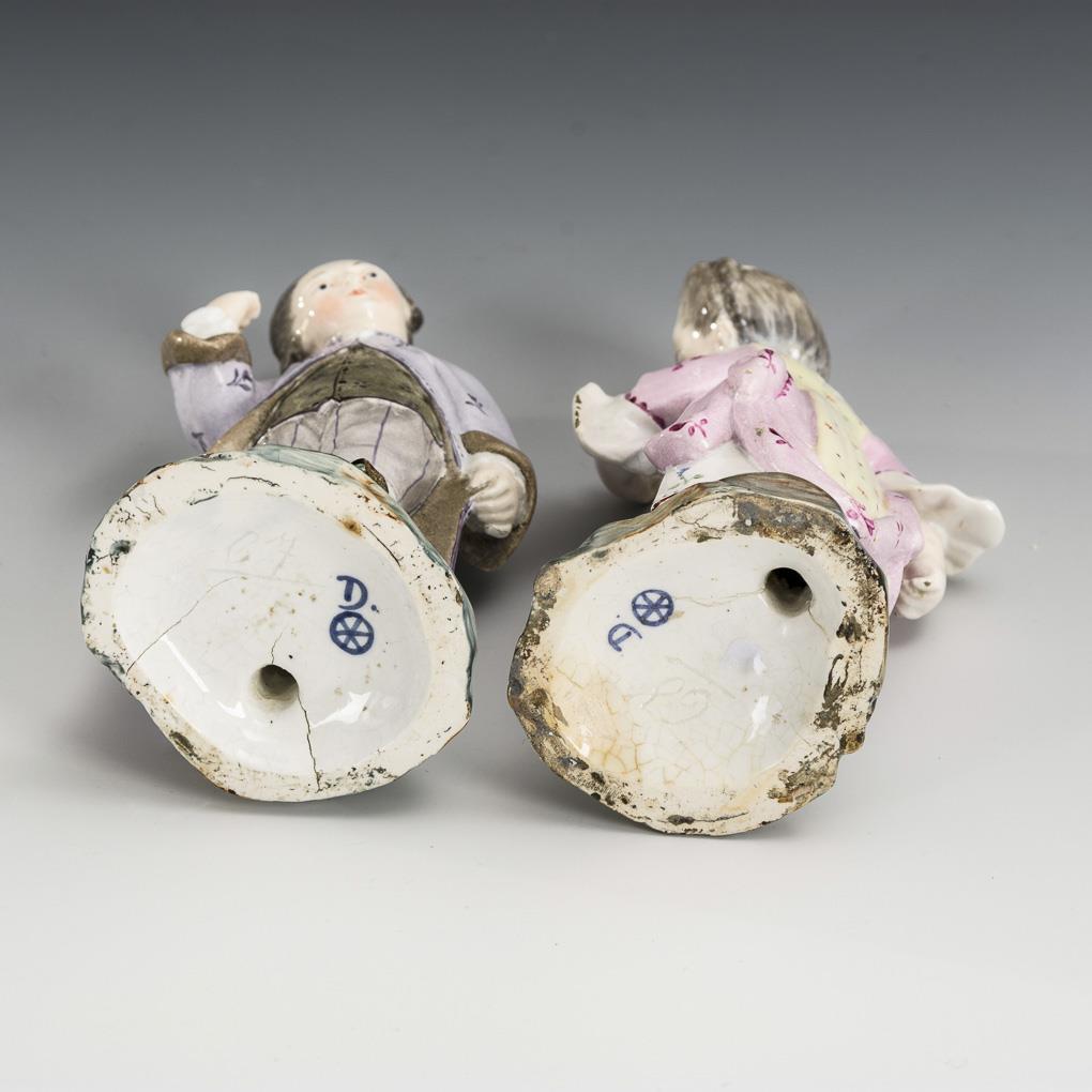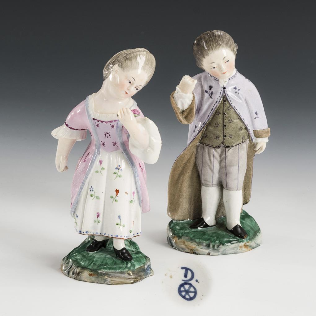 "Dame (Mädchen) mit einem Blumenstrauß" (H 13,5 cm). Grüßender "Herr (Knabe) im Mantel" (H 14 cm). Mädchen restauriert, Fußspitze des Jungen bestoßen, Sockel innen brandrissig, partiell Glasurchips.