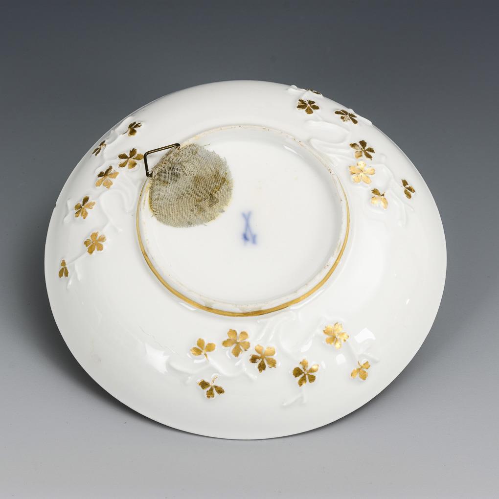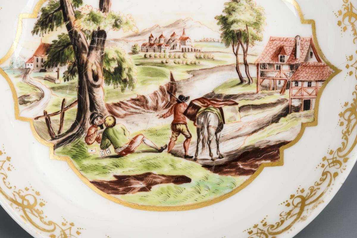 Untertasse mit Prunuszweigen. Im Spiegel eine goldgerahmte Kartusche mit der Darstellung einer Landschaft mit Schloss, Mühle, kartenspielenden Bauern sowie einem Bauern mit Pferd. Gold etwas berieben, Kratzspuren.