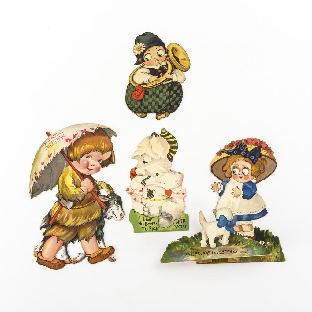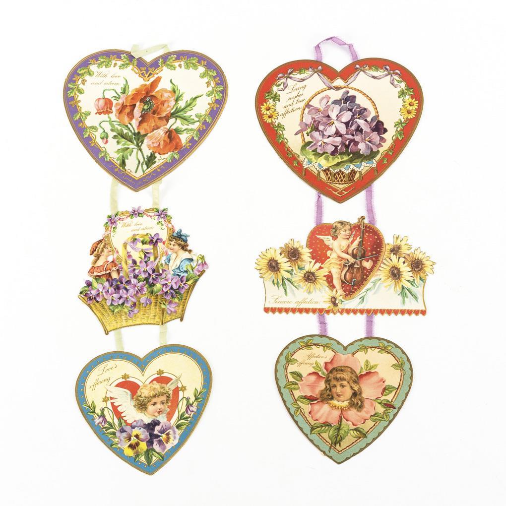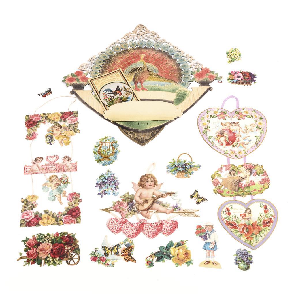 4 Grußkarten zum Valentinstag. Pappe, meist farbig lithografiert. H 14,5 - 21,5 cm. / 2 Valentinsanhänger. Pappe, farbig lithografiert. L je ca. 35 cm. / Konvolut 20 Kärtchen Valentinsgrüße. Pappe, teils farbig lithografiert. / Ca. 14 Glanzbilder (Oblaten), 3 mehrteilige Valentins-Anhänger "With Love" und ein geprägter Pappaufsteller mit Pfau. Max 43 x 40 cm. /