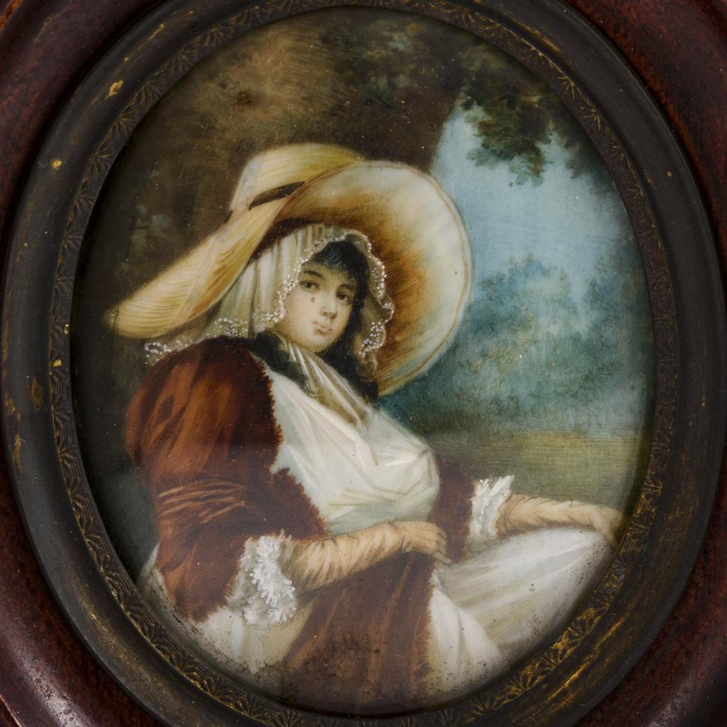 Elegante Damen vor angedeuteter Landschaft. Verso "Georg Romney: Mrs. Mark Currie" bzw. "John Opie: Mrs. Godwin" bezeichnet. Alters-/Gebrauchsspuren zumeist am Rahmen (Aufsteller fehlen).