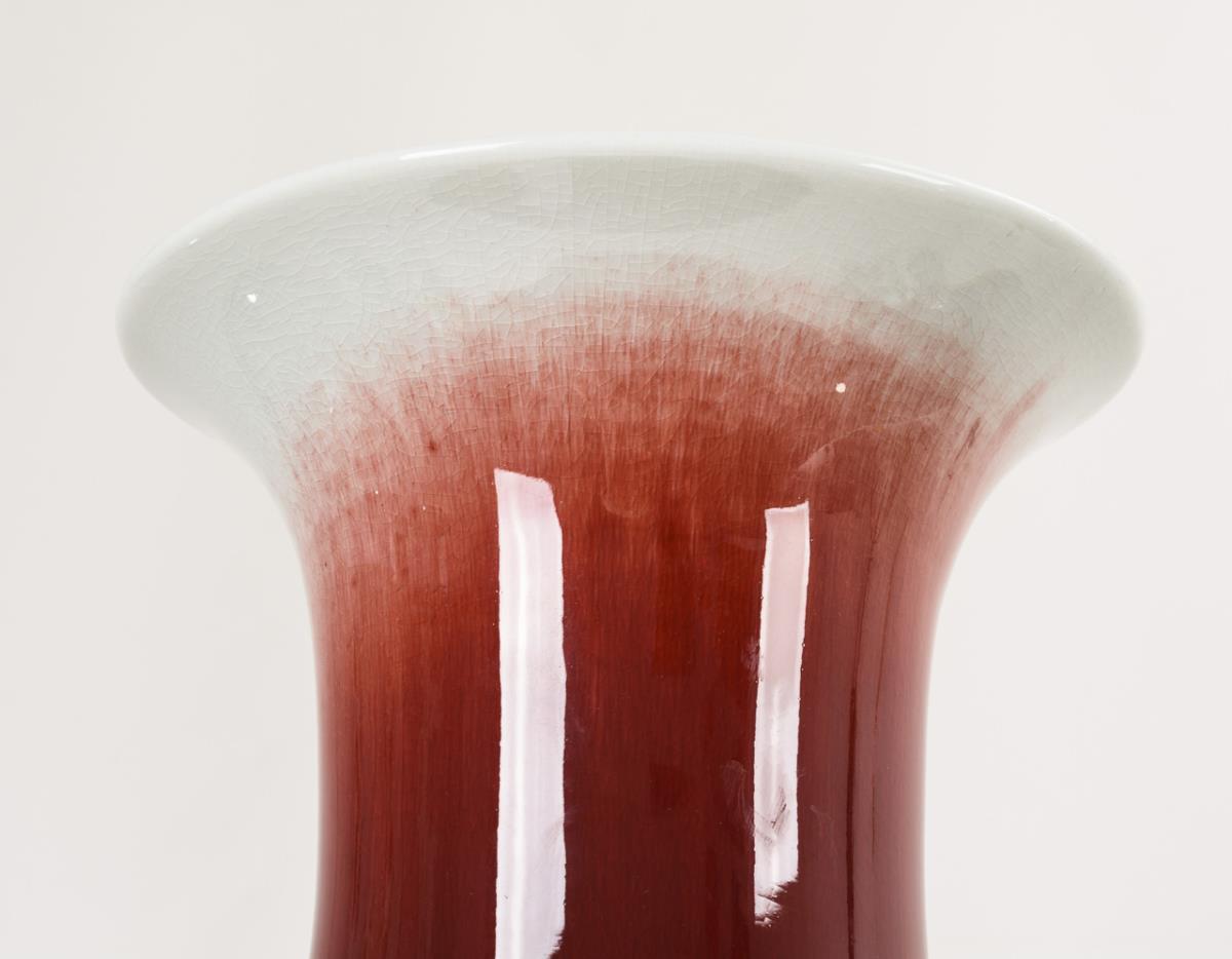 Sehr elegante, handgedrehte Balustervase. Am trompetenförmig ausschwingenden Hals Verlauf von weiß nach ochsenblutrot. Glasur mit feinem gleichmäßigen Krakelee, partiell zart geflammte Effekte, innen weiß glasiert .
