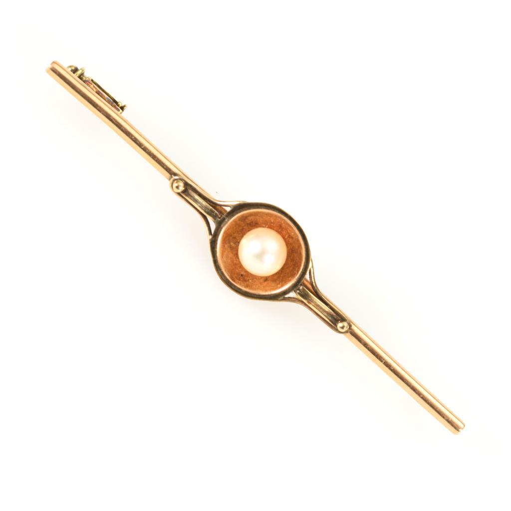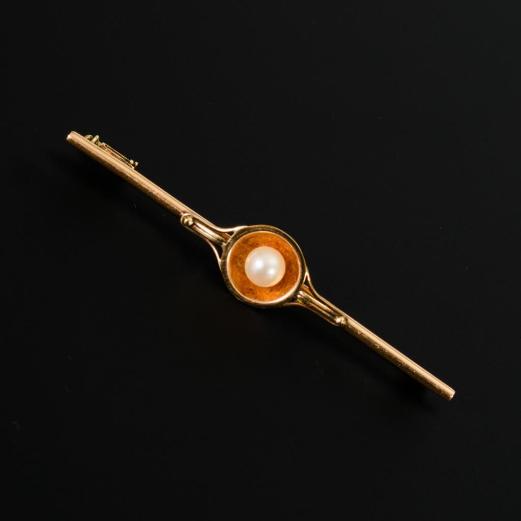 Cremefarbene Zuchtperle in Schalenfassung, auf verziertem Stab. Schiebehaken.
