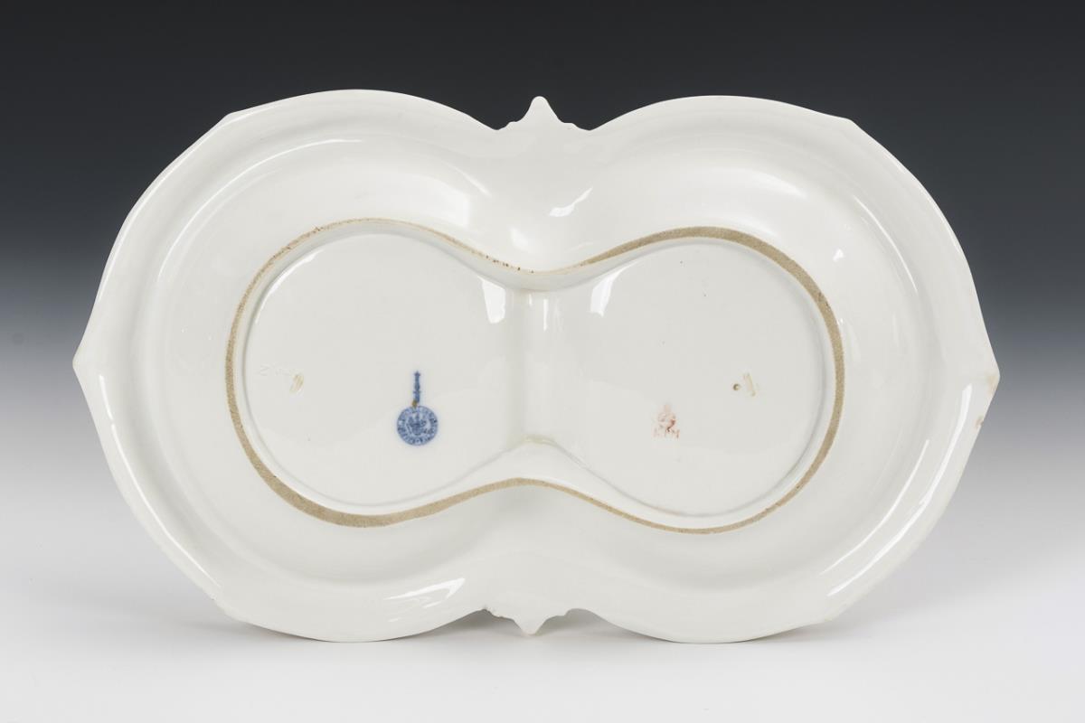 Doppelschale mit mittigem Henkel. In den Schalen jeweils die Malerei eines umgestürzten Blumenkorbes mit Rosen. Minimaler Goldabrieb, 2 kleine, unterseitige Randbestoßungen.