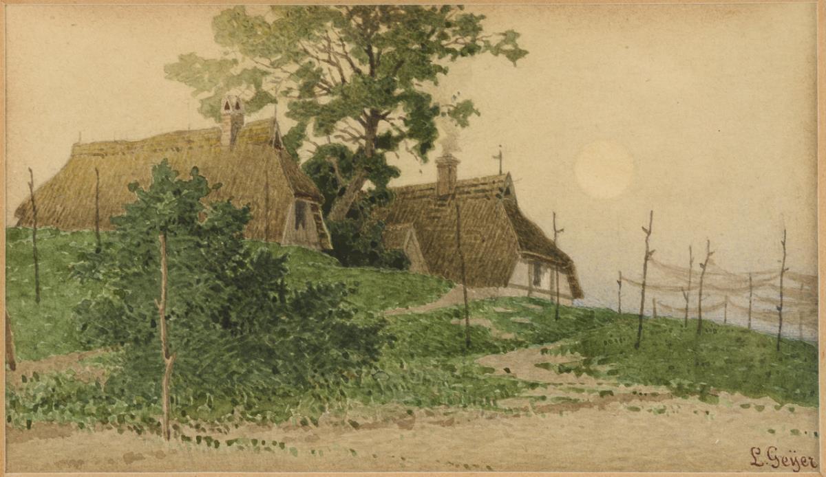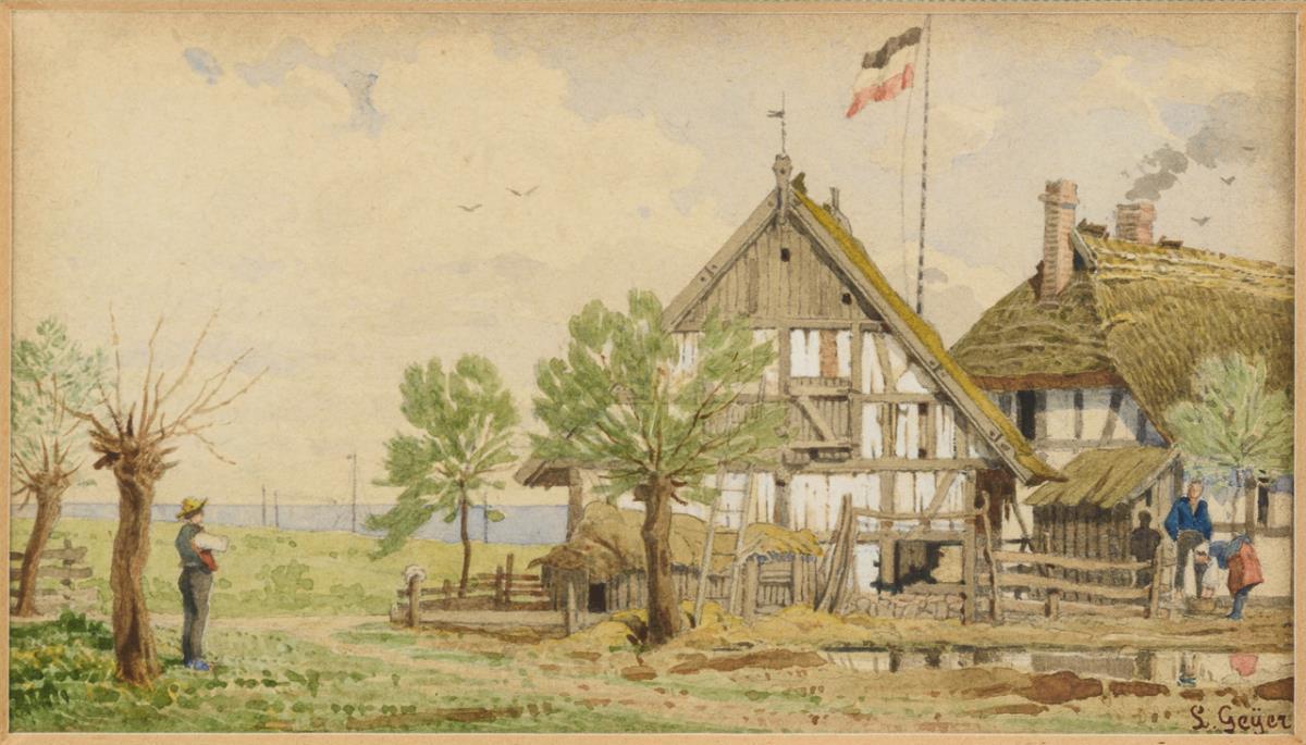 Je Darstellung einer norddeutschen Dorflandschaft mit reetgedeckten Fischerhäusern nahe der Küste.