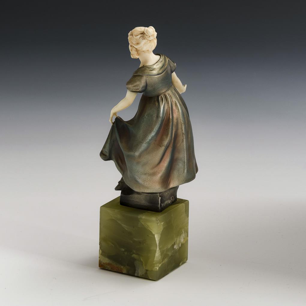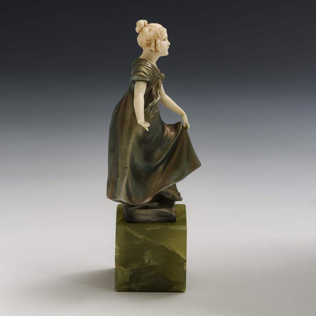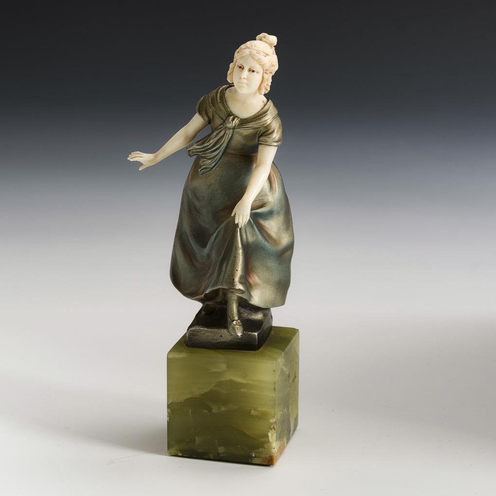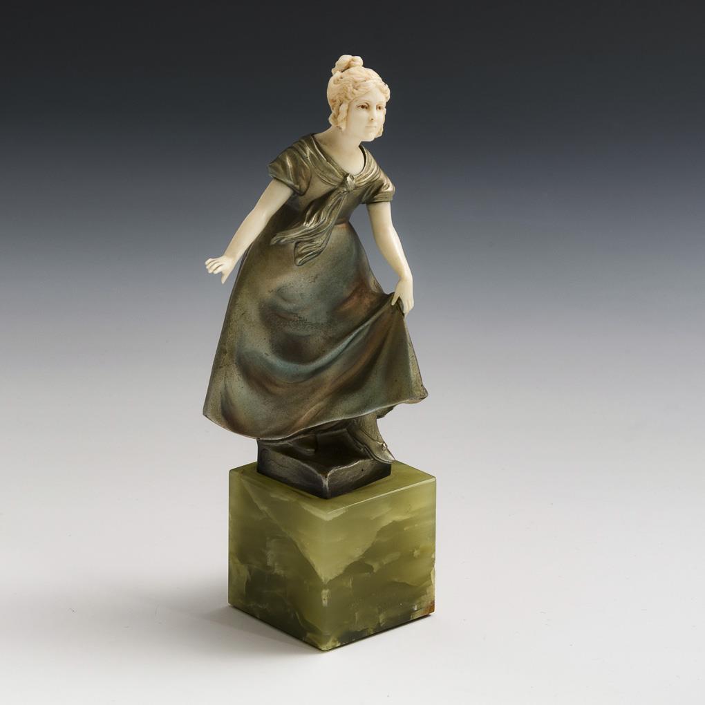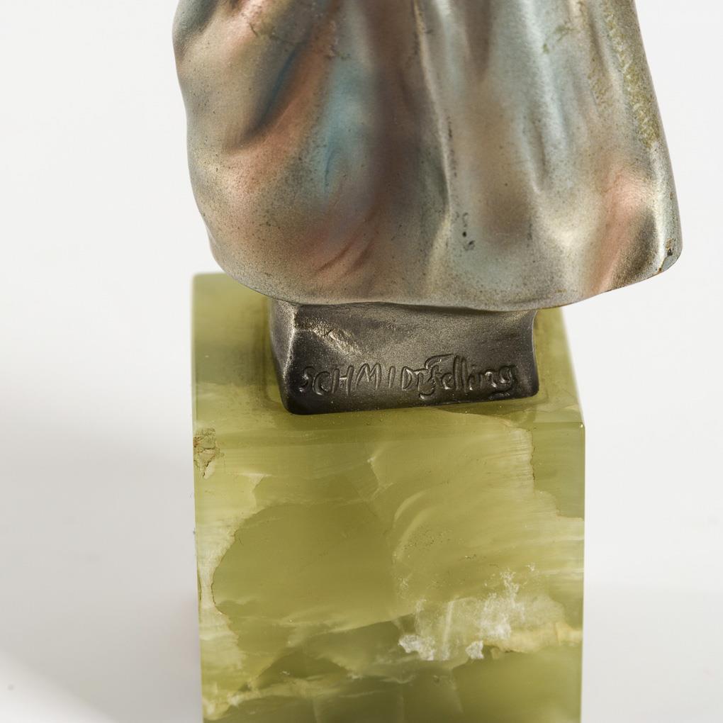 Bronze mit eloxierender Farbe gespritzt, Inkarnat aus Elfenbein teils mit Resten einer Fassung, Sockel aus grünem Onyxmarmor. 1. Hälfte 20. Jh. Bezeichnet mit Gießermarke Preiss & Kassler. H 12 / 17 cm.