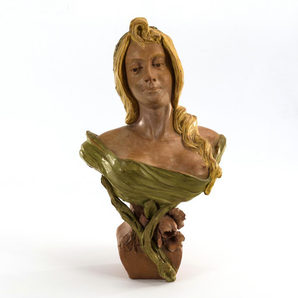 Lebendig gestaltete Frau (Flora?) mit Haarreif sowie Blumen am Sockel. Brandriss an Hals/Schulter, sonst wenige Alters-/Gebrauchsspuren.