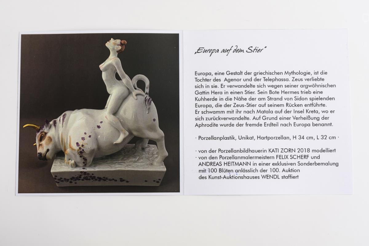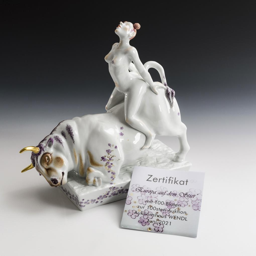 Erotische Plastik der verzückt auf dem knienden Stier sitzenden Europa. Die Plastik der "Europa auf dem Stier" wurde von den Porzellanmalermeistern Felix Scherf und Andreas Heitmann in einer exklusiven Sonderbemalung mit 100 Blüten anlässlich der 100. Auktion des Kunstauktionshauses Wendl staffiert.