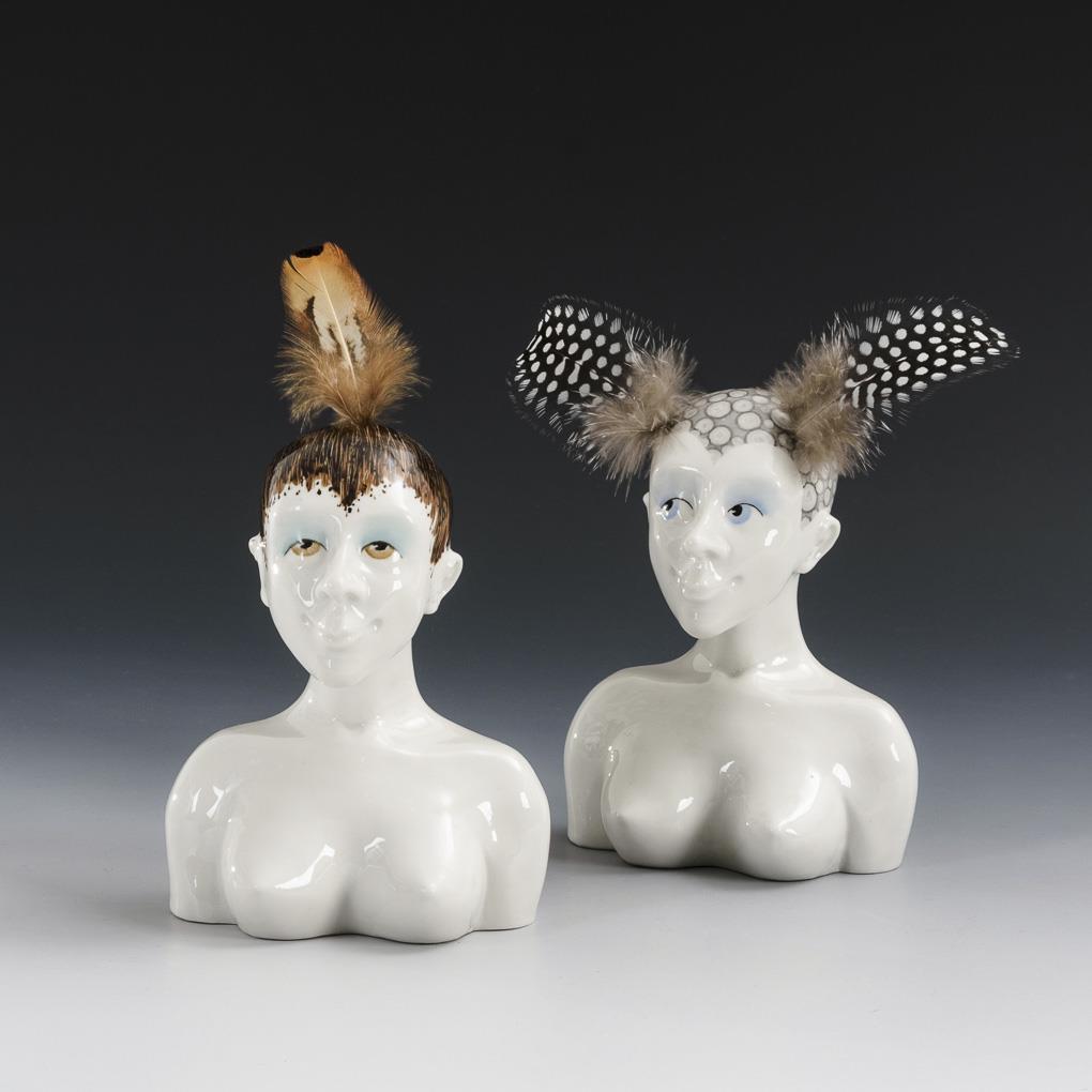 Frauenbüsten mit eingesteckten Federn.