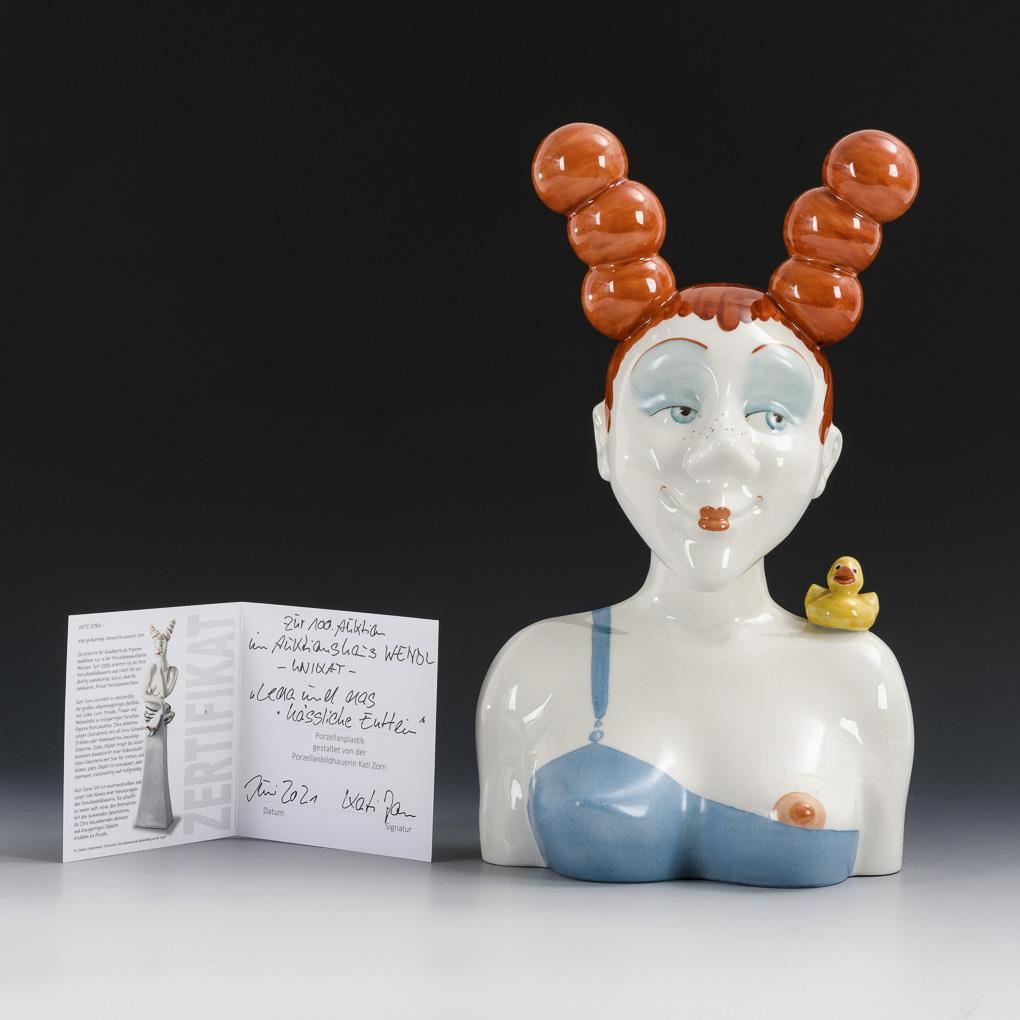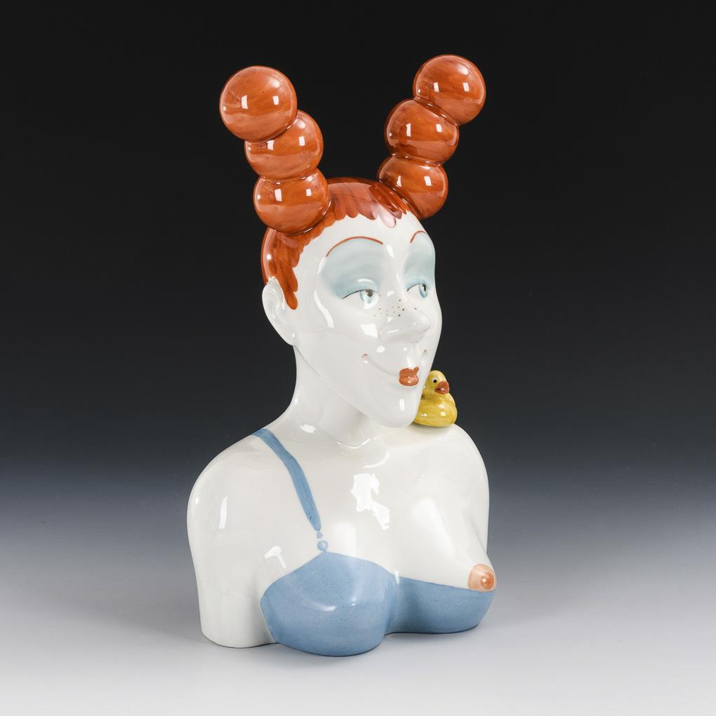 Büste einer jungen Frau mit roten Haaren, auf ihren Schultern ein Badeentchen sitzend.