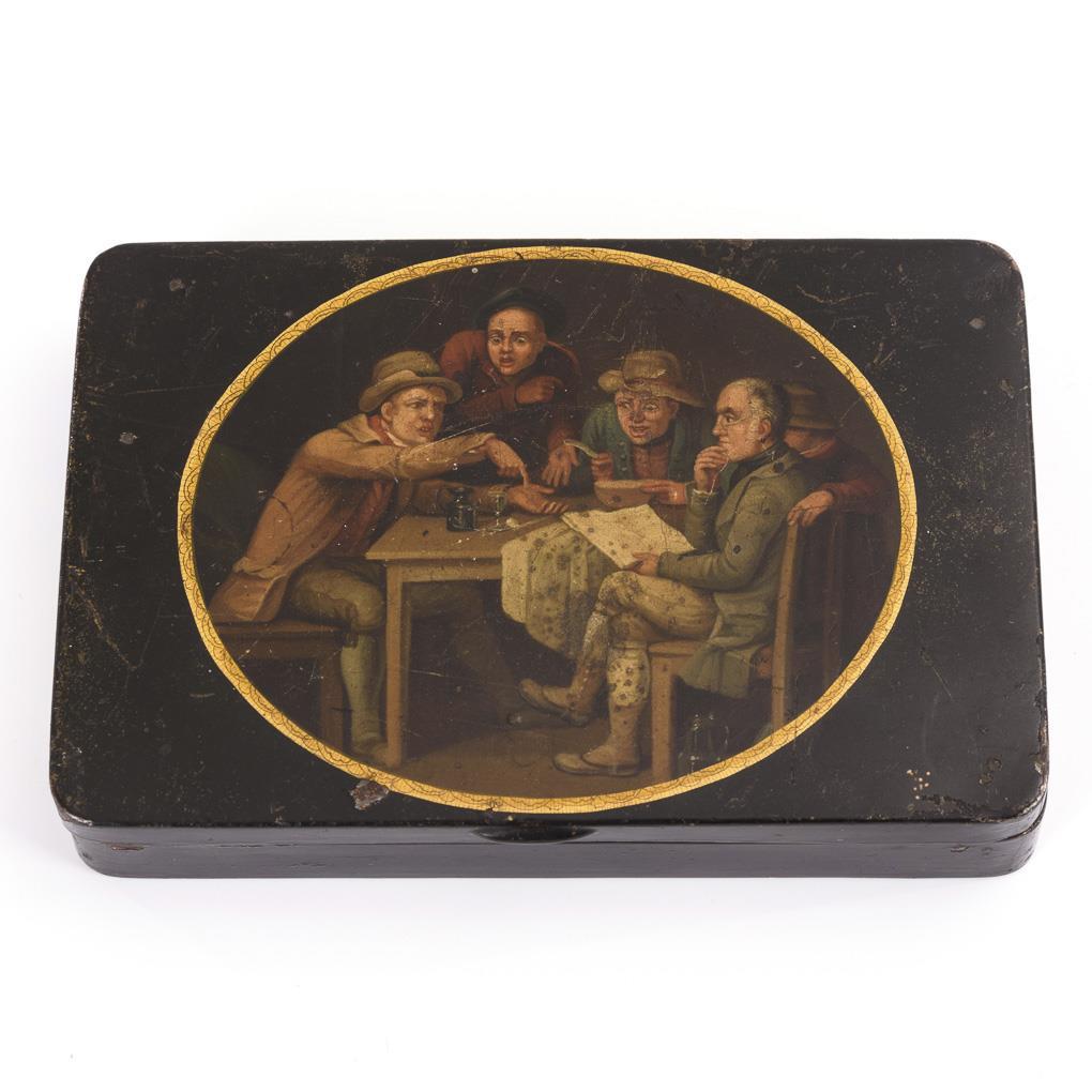 Flache Quaderdose; auf dem Scharnierdeckel ovale Szene mit disputierenden Herren nach David Wilkie. Einige Alters-/Gebrauchsspuren.