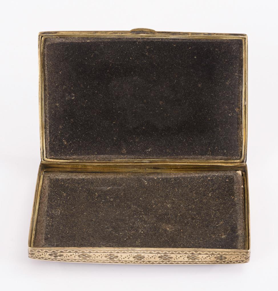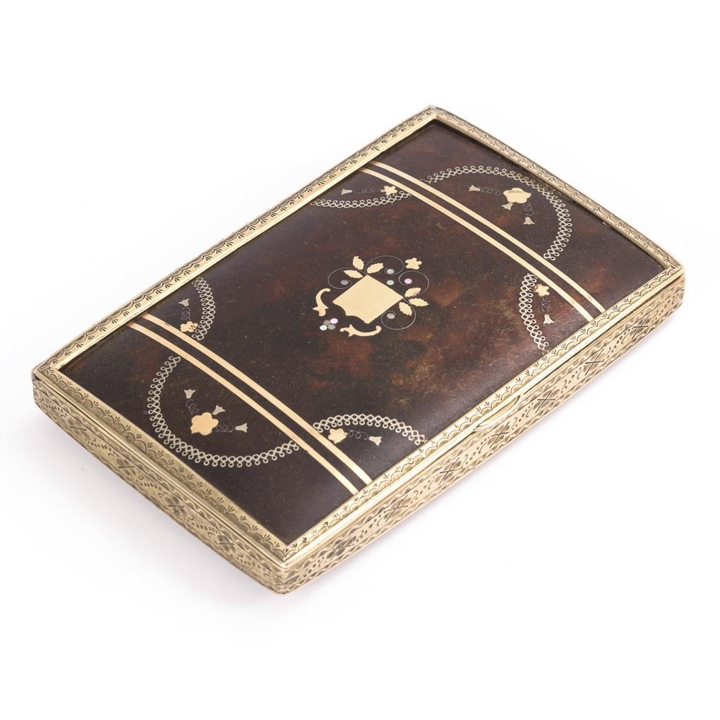 Flache Quaderdose mit Gravuren auf den leicht sphärischen Wandungen. Scharnierdeckel und Boden aus Schildpattimitat, auf dem Deckel eingelassenes Metall-Ornament in Piqué-Art mit leerem Wappenschild. Einige Alters-/Gebrauchsspuren und 1 geringer Ausbruch am Imitat.