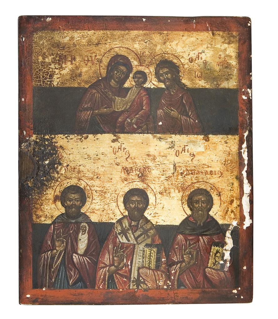 Zweireihige Ikone. Oben als Halbfiguren Gottesmutter Hodegetria, ihr zugewandt Johannes der Vorläufer. Unten als Dreiviertelfiguren drei orthodoxe Heilige. Beschädigt, restaurierungsbedürftig.