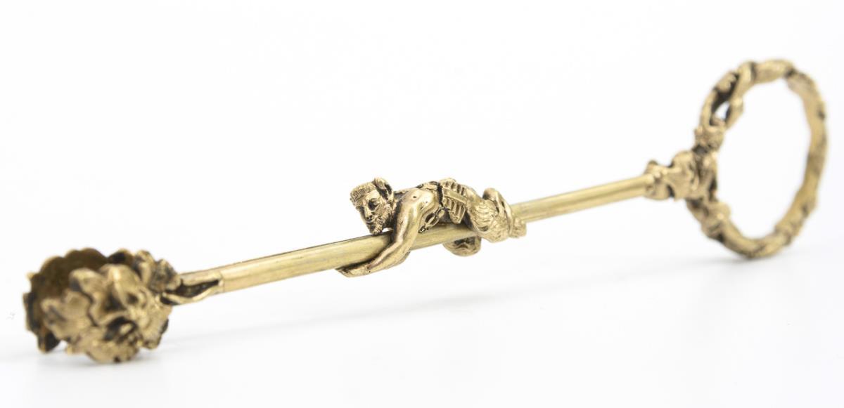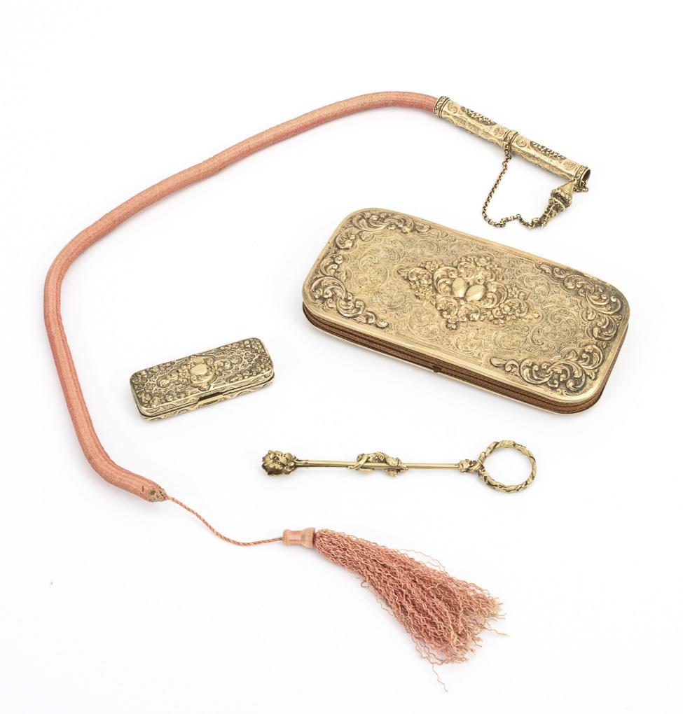 Holzkorpus mit Scharnierdeckel und seitlichem Schub. Darunter zwei verzinnte Fächer. Ornamentale Marketerie aus Schildpatt und Zinn. 4-teilige Silber-Garnitur mit undeutlichen Miniatur-Punzen: Luntenhalter, Zündholzdose mit Reibefläche, Zange mit Faun als Schieber, ein Etui mit doppelseitger Inneneinrichtung. Silber, allseits fein graviert, reliefiert, teils plastisch gearbeitet. Marketerie partiell leicht defekt, Mundstück fehlt.