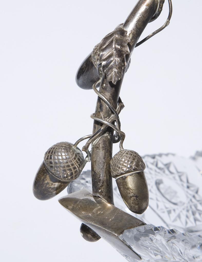 Dickwandiges farbloses Glas mit reichem ornamentalen Schliffdekor. Hochstehender Tragegriff mit plastischen Eicheln und Laubwerk. Montierter Silber-Standfuß mit zwei kleinen undeutlichen Punzen. Rand partiell bestoßen, kleine Delle im Standfuß.
