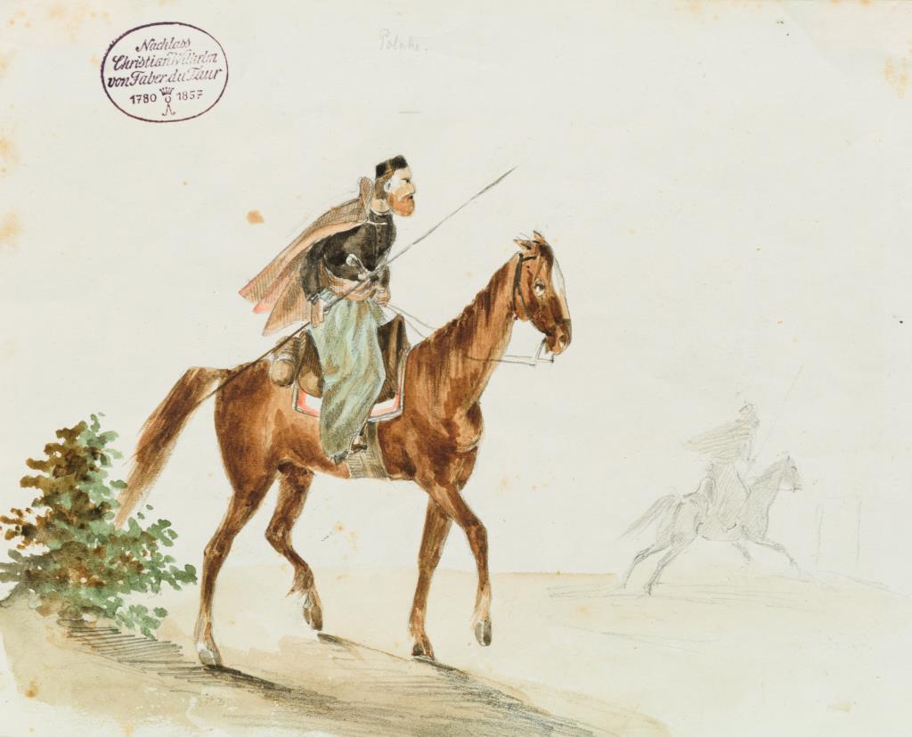 Bleistiftzeichnung "Sendlingerthor in München" (1809) und kolorierte Zeichnung mit polnischem Ulan "Polake". Etwas geknickt | Stockflecke.