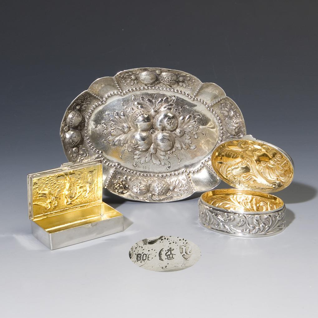 Floral und figural reliefiert. Dosen innen vergoldet, mit Scharnierdeckel und Daumengriff. Punzen: Feingehalt, zwei Fabrikmarken, einmal Halbmond und Krone.