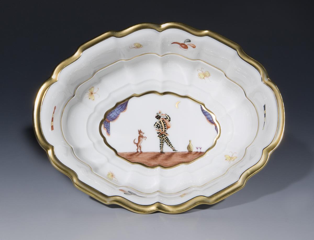 Form-Modell von Johann Jacob Irminger 1710-1715. Dekor-Nr. 288793. Farbig bemalt, gold staffiert. Dekor aus der Commedia dell'arte nach Vorlagen von Jacques Callot (1592-1635). Pressmarke, Malermarke, Schwertermarke, goldener Schriftzug.