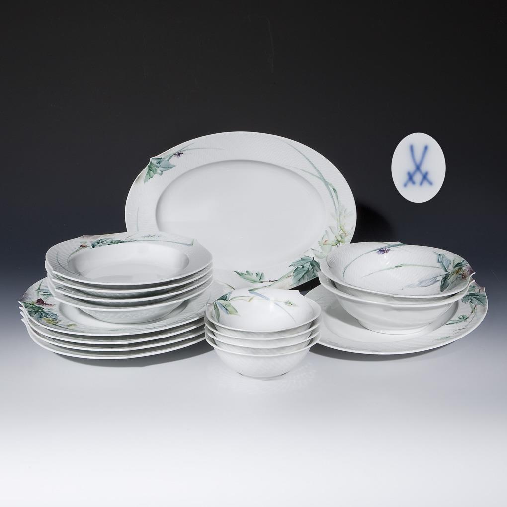 Form-Modell von Sabine Wachs und Jörg Danielczyk 1996. Form "Wellenspiel-Relief". 4 Essteller, 4 Suppenteller, 4 Dessertschalen, 2 Schalen, 2 Platten. Dekor-Nr. 614501. Farbig bemalt, Dekor "Waldflora und Insekten". Pressmarken, Malermarken, Schwertermarken.