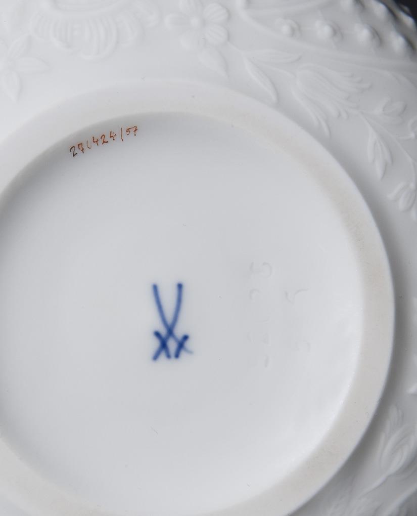 Relief-Modell von Johann Joachim Kaendler 1739. Reliefdekor "Marseille". Dekor-Nr. 270424. Feine farbige Bemalung mit Szenen nach Jean Antoine Watteau. Camaieumalerei in Purpur mit Einzelblüten, gold staffiert, goldene Zahnkante. Pressmarken, Malermarken, Schwertermarken.