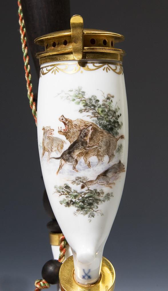 Dekor-Nr. 265028. Beidseits farbig bemalt. Jagdmotive nach Johann Elias Ridinger, Goldbordüre. Pfeifenkopf und Abzug mit Messing-Montierung. Gedrehtes Holz-Gesteck mit Horn-Mundstück. Malermarke, Schwertermarken.