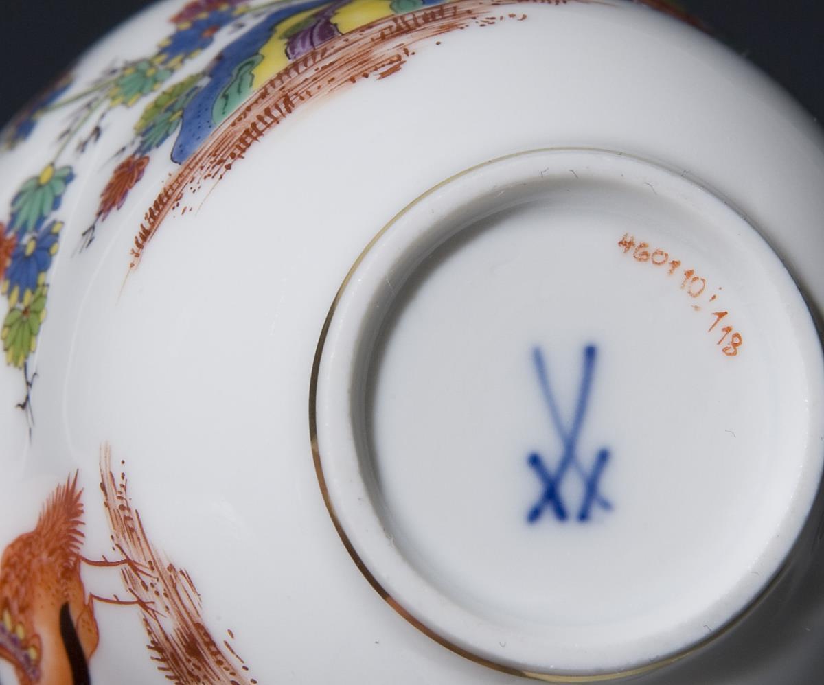 Form "Neuer Ausschnitt". Dekor-Nr. 460110. Farbig bemalt, gold staffiert, "Altes indisches Blumen- und Kranichdekor" mit Goldpunkten. Pressmarken, Malermarken, Schwertermarken.