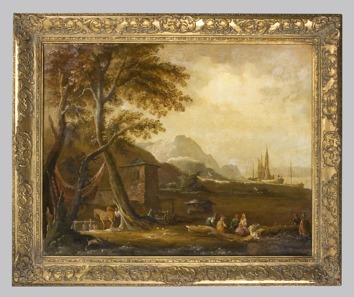 Die kulissenhafte Landschaftsauffassung mit räumlicher Tiefe und reicher Figurenstaffage ist in gleichmäßiger Tiefe aufgebaut. Vergoldeter Stuckrahmen. Im Himmel ein kleines Loch.
