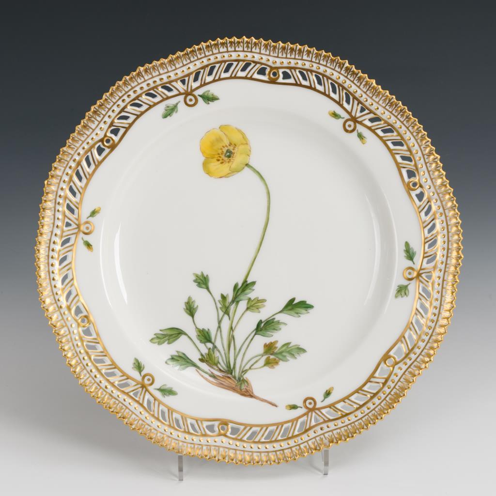 Teller mit stabdurchbrochener Fahne und gezacktem Rand. Im Spiegel eine fein gemalte Pflanze des Islandmohns, unterseitig lateinisch bezeichnet.