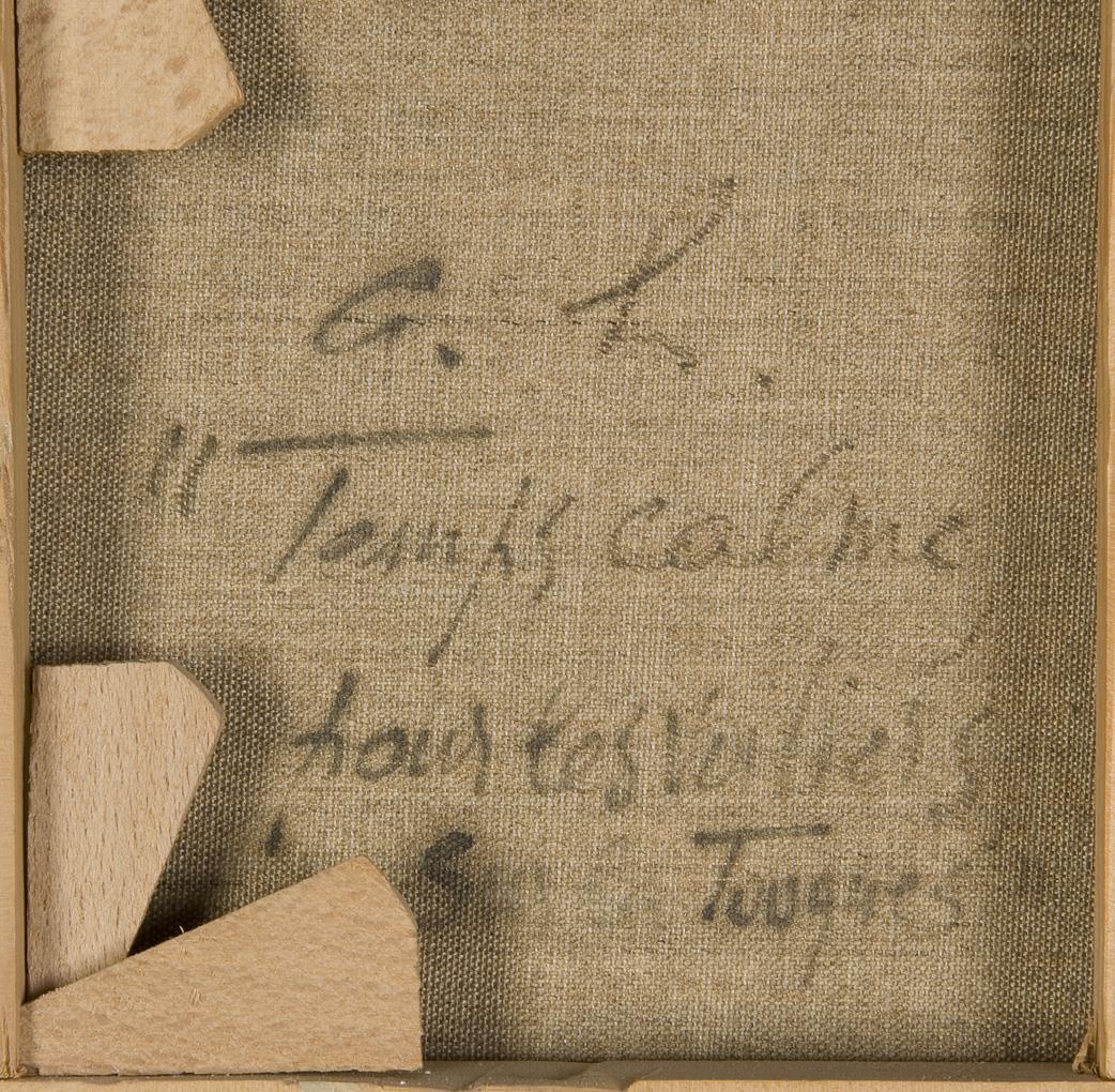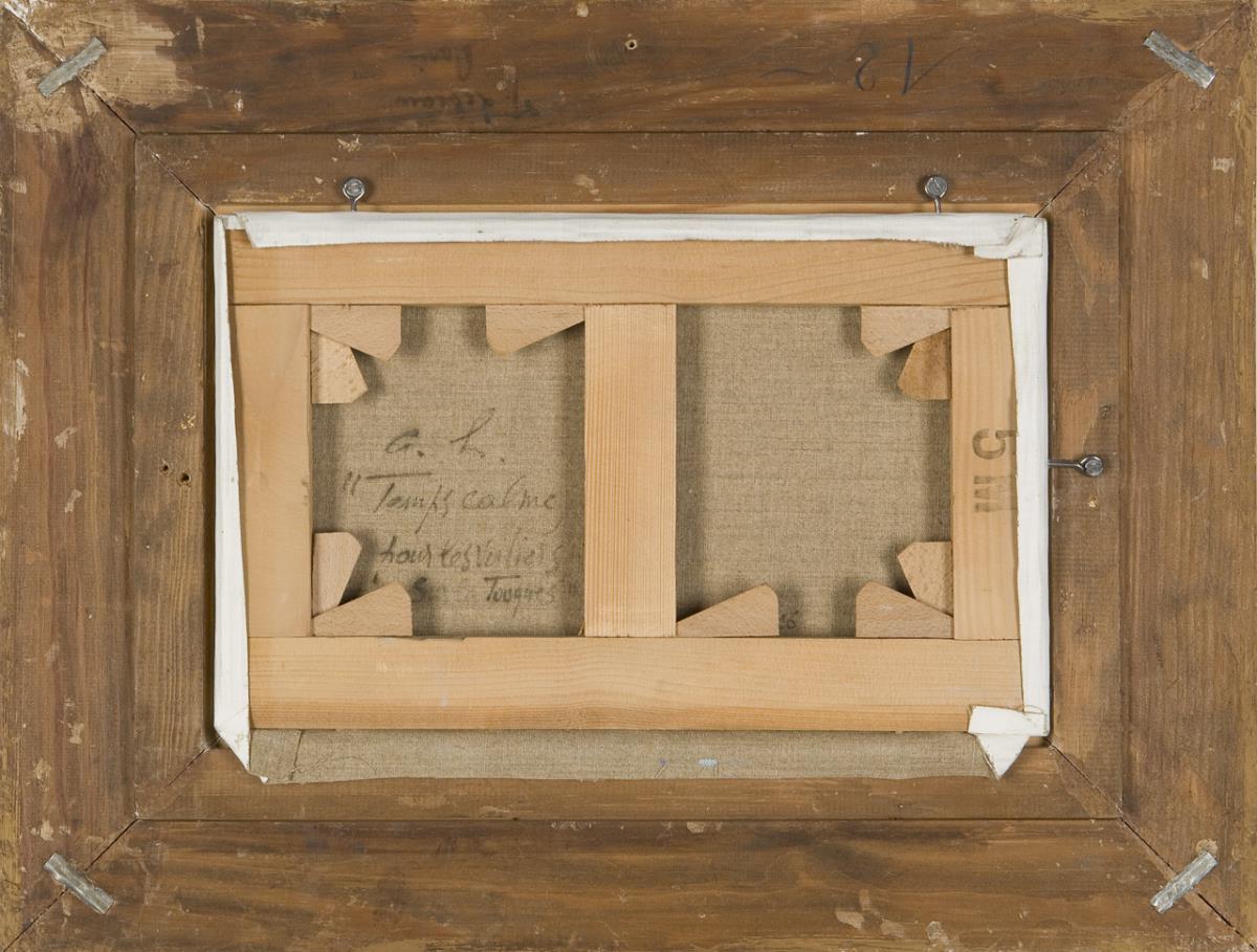 Rückseitig auf der Leinwand französisch bezeichnet. Vergoldeter Stuckrahmen mit Leinen-Passepartout. Rahmen minimal defekt.