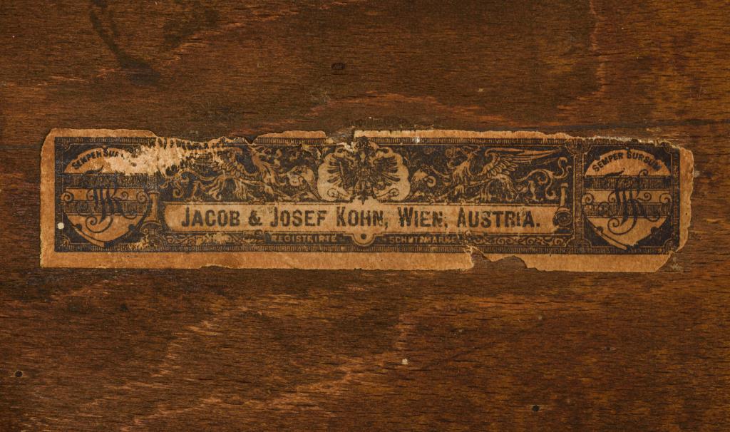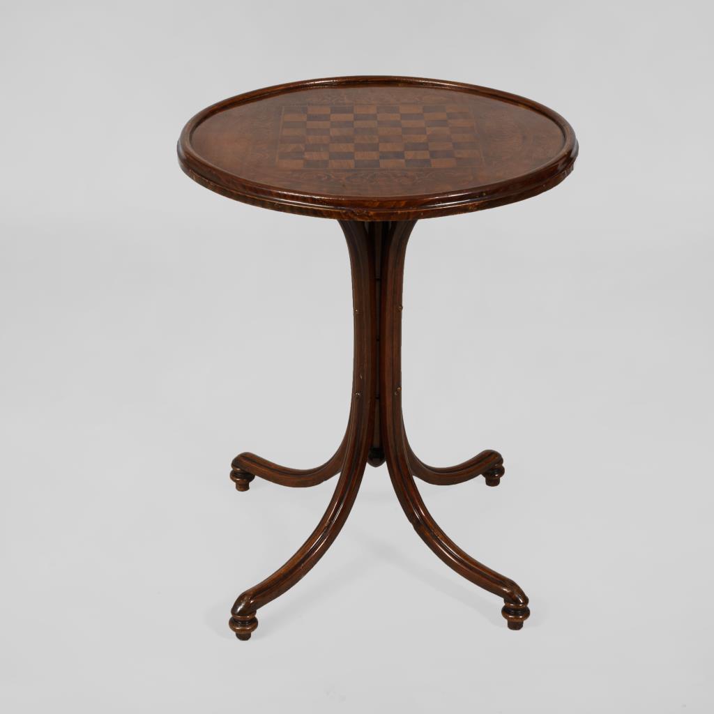 Kleiner Beistelltisch mit Schachbrett- und historistischem Bandelwerkdekor, auf Mittelstütze mit 4 c-förmig gebogenen Beinen, Manufakturetikett "Jakob und Josef Kohn, Wien". Restauriert, inaktiver Anobienbefall, Gebrauchsspuren.