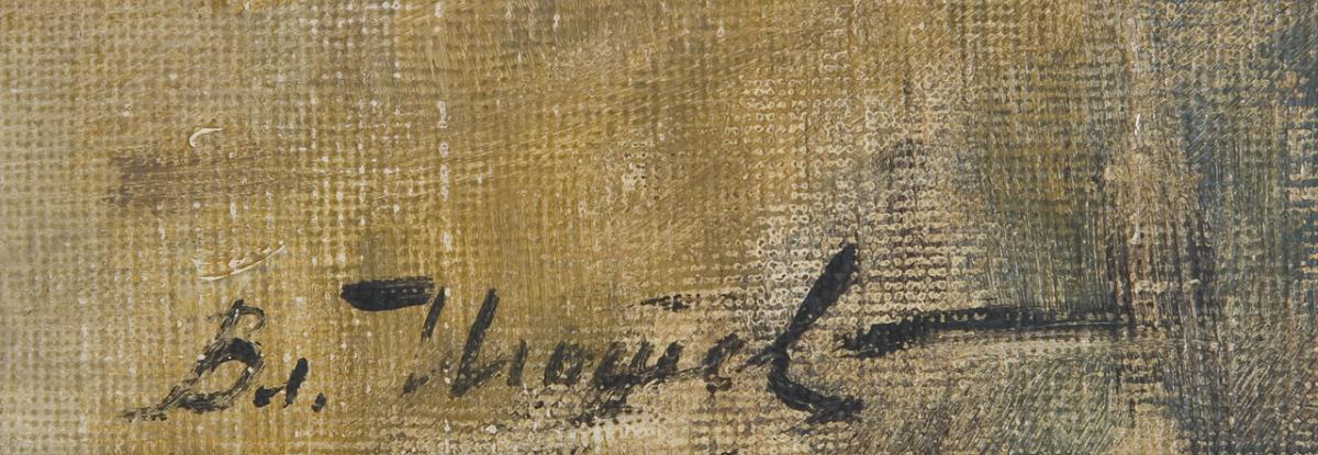 Eine ausgewogene Komposition mit gekonnter Linienführung und leichtem Pinselstrich in harmonischem Kolorit. Rückseitig kyrillischer Klebezettel. Silberrahmen.
