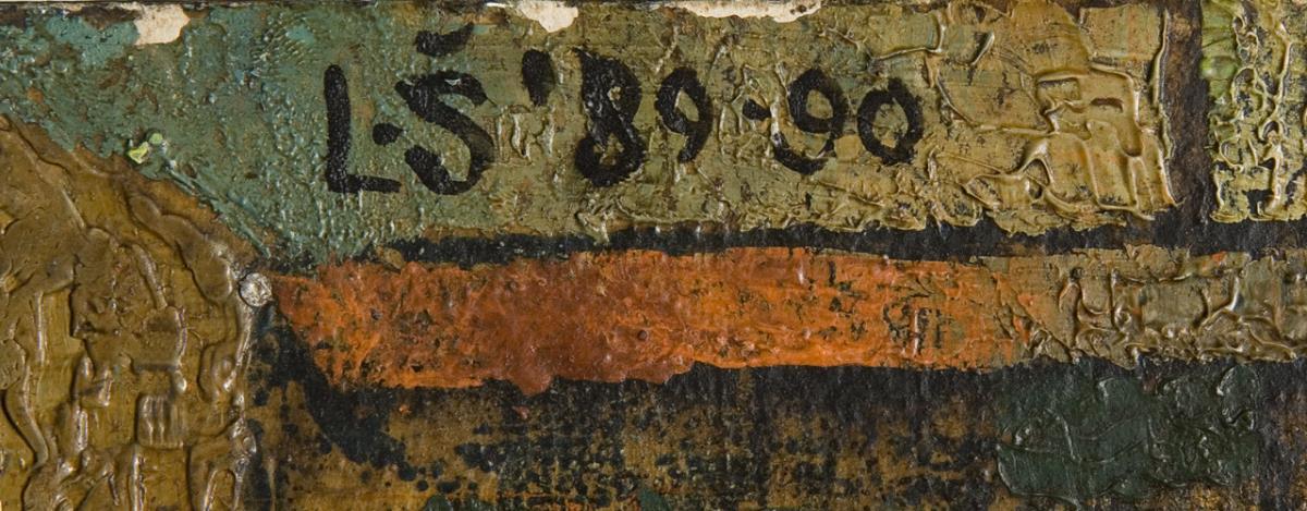 Mischtechnik, Papier auf Karton, auf Holzleiste montiert. Monogrammiert. Datiert: (19)89-90.