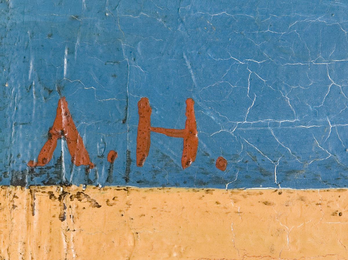 Konstruktivistische Malerei mit kräftigen bunten Farbflächen, runden und eckigen Formen. Weiß gefasster Rahmen mit Leinenbezug. Partiell Craquelé.