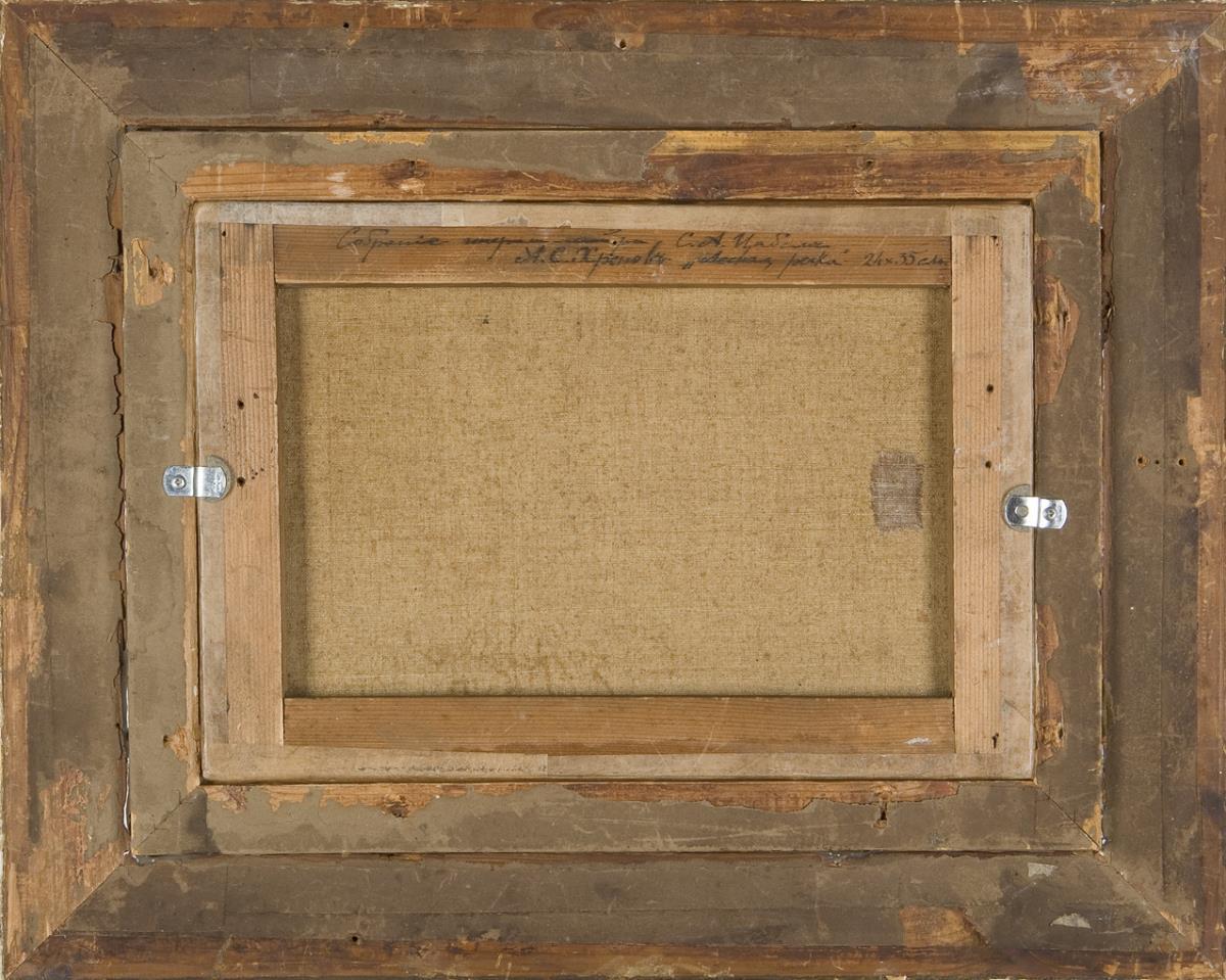 Romantischer, überlegt komponierter Landschaftsausschnitt. Rückseitig auf dem Keilrahmen alt kyrillisch bezeichnet. Vergoldeter Stuckrahmen. Rückseitig ein kleiner Flicken, Rahmen partiell defekt.