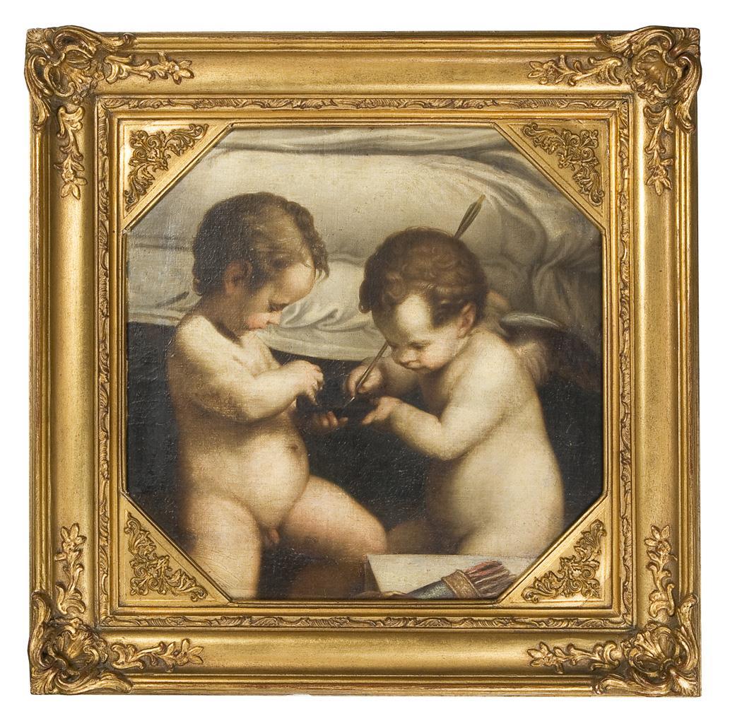 Die kindlichen Liebesgötter sind als verniedlichte nackte Knaben mit Flügeln und ohne Flügel dargestellt. Breiter vergoldeter Stuckrahmen. Doubliert, Craquelé, partiell minimale Farbabplatzer.
