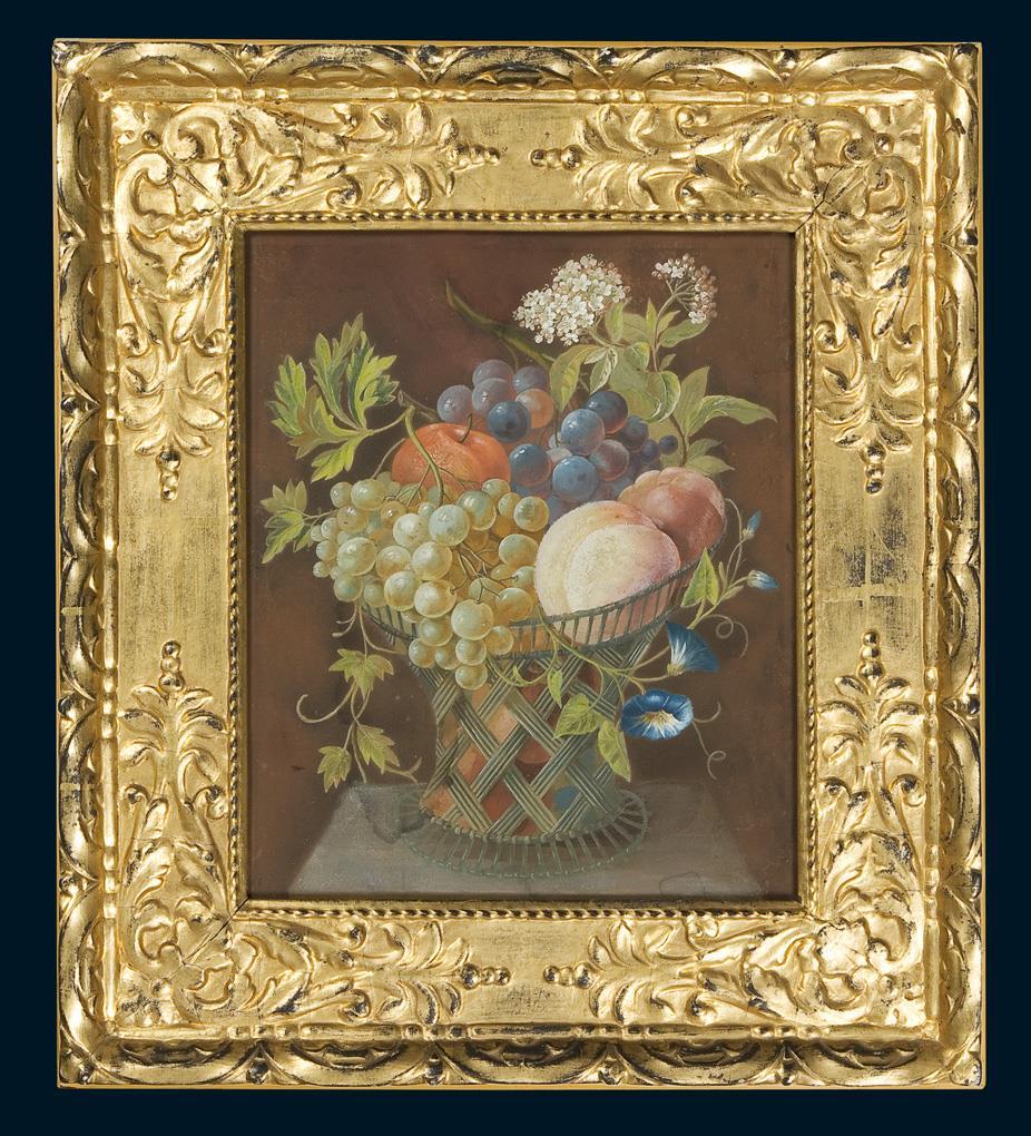 Dekorativ ist ein prall gefüllter Obstkorb als eine in die Fläche ausgebreitete Einheit konzipiert. Die Feinheit der Farben eignet sich hervorragend, den angestrebten Detailreichtum zu verwirklichen. Breiter verglaster, vergoldeter Stuckrahmen. Am oberen Rand ein Riss, im unteren Bereich zwei Flecken.