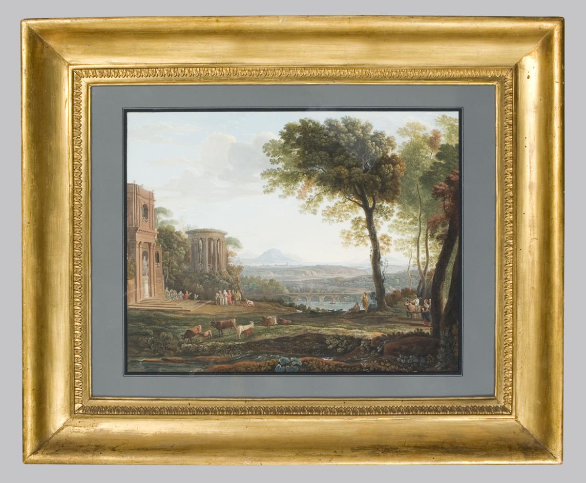 Lyrisch-romantische Ansicht mit Amortempel und Tempel der Vesta. Reiche Figurenstaffage mit Vestalinnen, Hirten und Weidevieh. Ein Schauplatz glückseligen, idyllischen Landlebens, farblich in feinen Abstufungen und lichten Tönen. Original verglaster, vergoldeter Rahmen aus der Zeit.