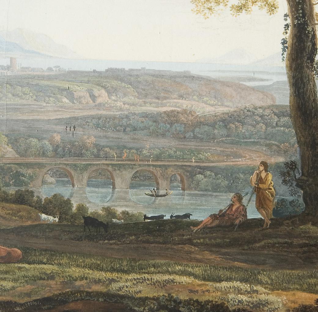 Arkadien, eine Landschaft, verklärt zum Ort des Goldenen Zeitalters, wo Menschen unbelastet in einer idyllischen Natur als glückliche Hirten lebten. Das Thema zahlloser Gemälde des 16. bis 18. Jahrhunderts. Die sichtbar gewordene Harmonie zwischen Mensch, Natur und Geschichte wurde zum Vorbild für viele Maler der kommenden Generationen * Partnerauktion Bergmann.