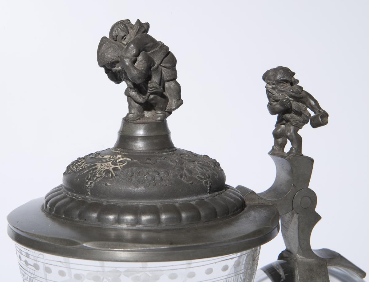 Farbloses Glas mit Schnittdekor. Umlaufend Weinlaub zwischen Ornamenten. Am Fuß Weinlaub-Bordüre. Zinn-Montierung von Otto Wittorf Hamburg. Drücker und Bekrönung plastisch gearbeitet. Standfuß und Lippe minimal bestoßen.