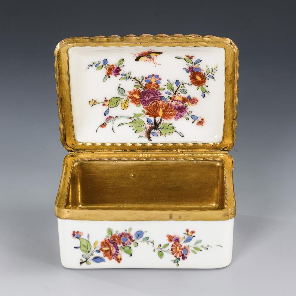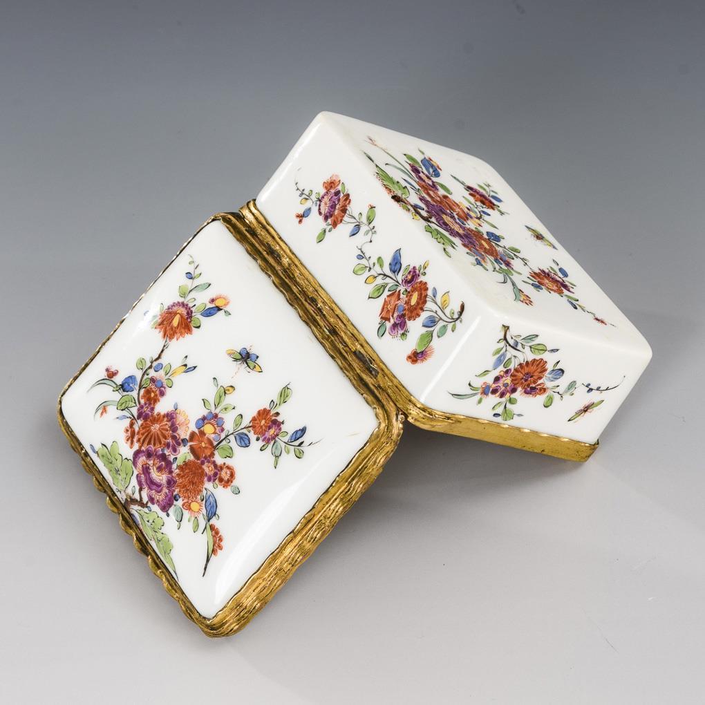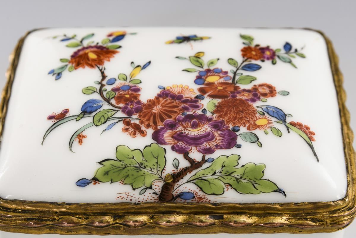 Rechteckige Dose mit dünn vergoldeter Metallmontierung. Allseitig bemalt mit indianischen Blumen.