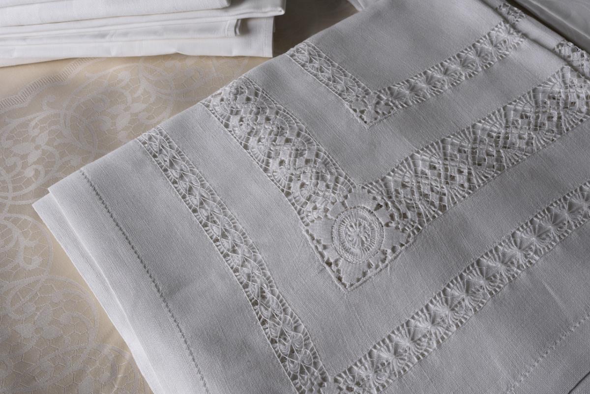 2 Tafeltücher, 5 Tischtücher, und 7 Servietten mit verschiedenen Dekoren, 1 Tafeltuch mit Klöppelspitze. Vereinzelte Flecken.