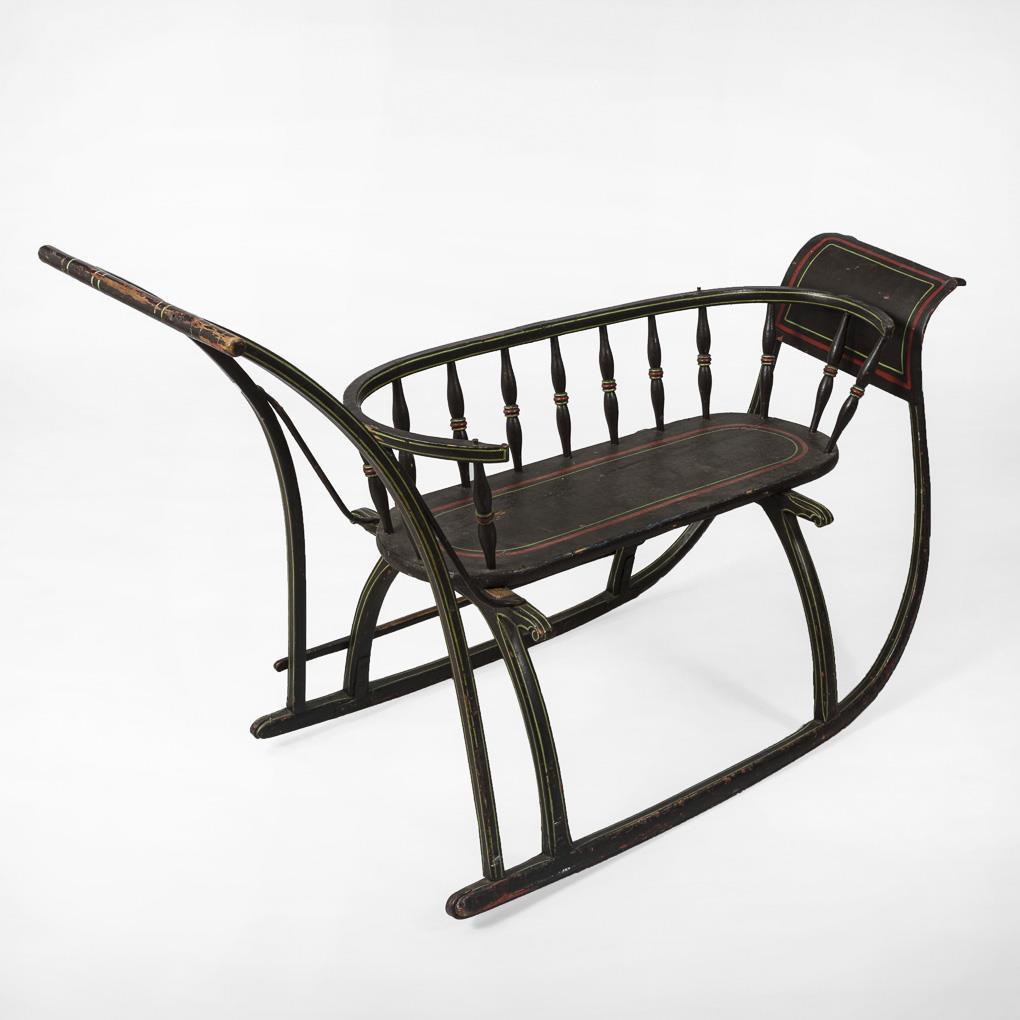 Filigran-geschwungener Korpus und ovale Sitzbank mit Sprossenlehne (seitlich zu benutzen). Beschläge und Kufen aus Eisen. Alters-/Gebrauchsspuren, Sitzbank lose, Farbfassung mit Defekten.