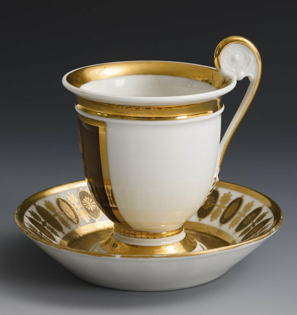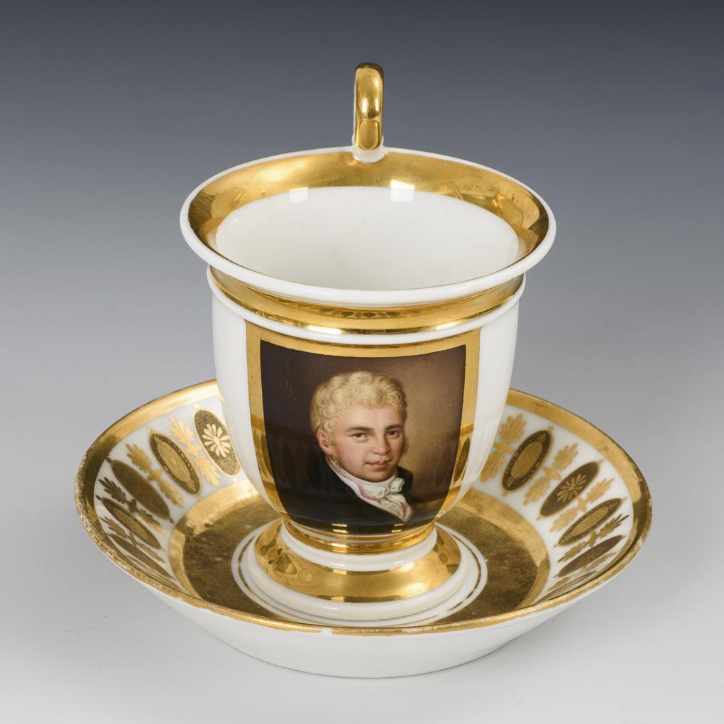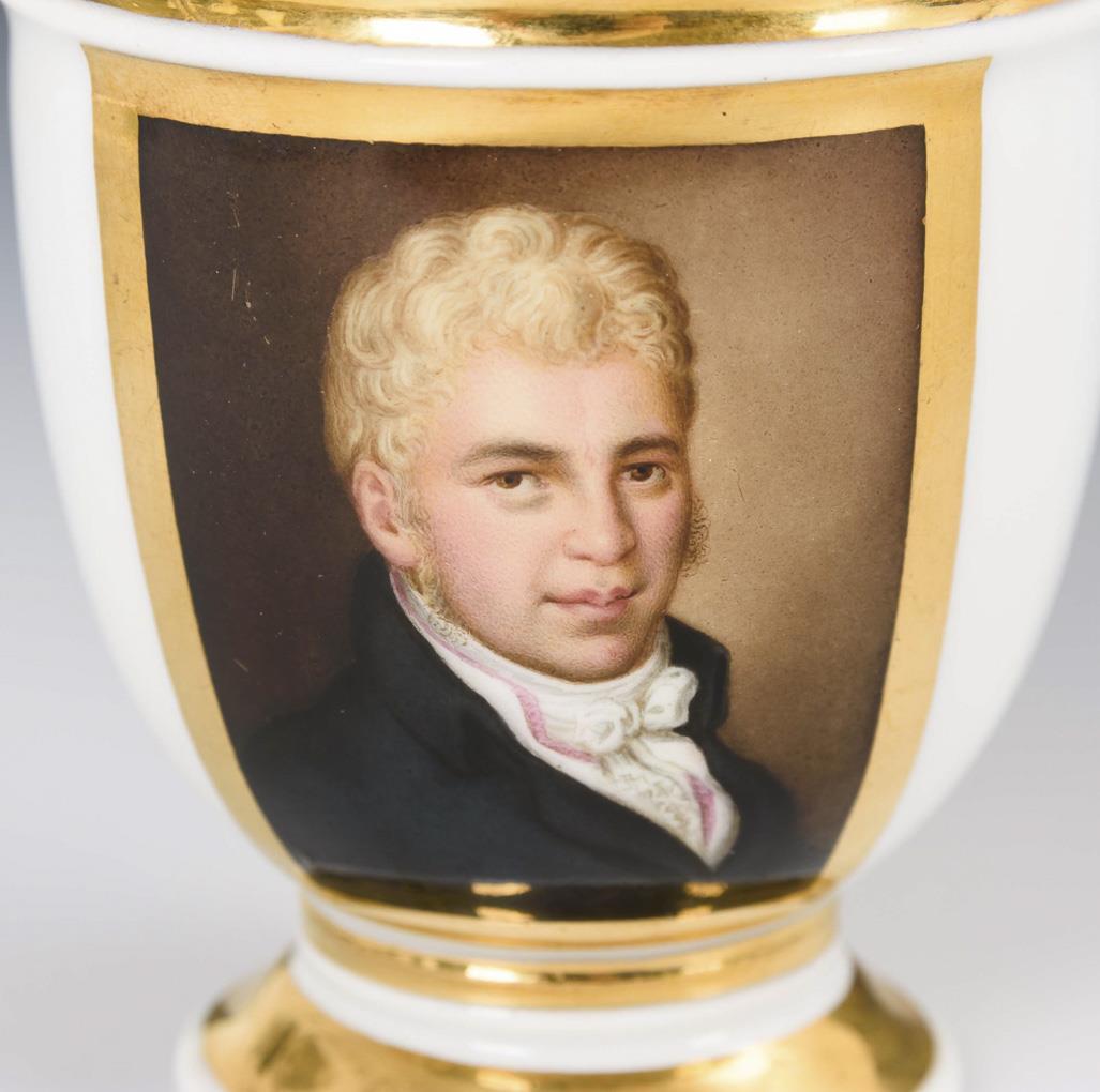 Gefußte Glockentasse mit Rosettenhenkel. Schauseitig eine goldgerahmte Rechteckkartusche mit einem fein gemalten Herrenporträt.