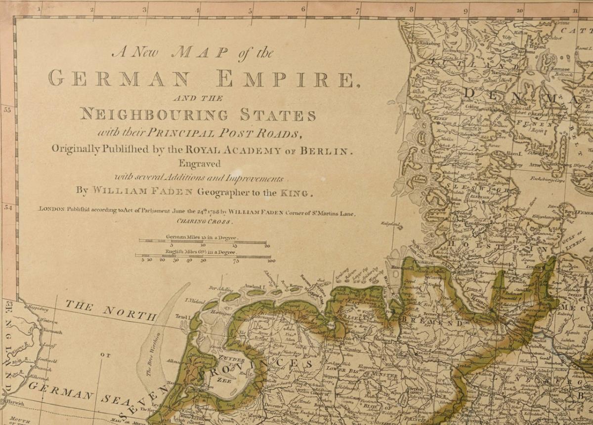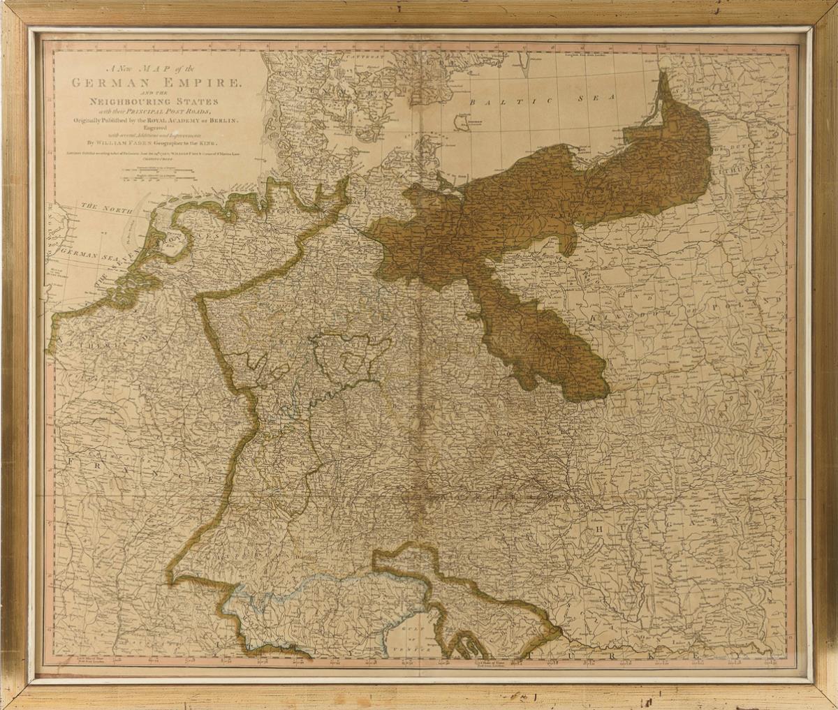 Detailreiche Postroutenkarte des Heiligen Römischen Reiches (deutscher Nation) und angrenzender Staaten am Vorabend der Französischen Revolution 1789, bezeichnet "A new Map of the German Empire and the Neighbouring States". Mehrfach gefaltet, etwas stockfleckig, Lichtschaden.
