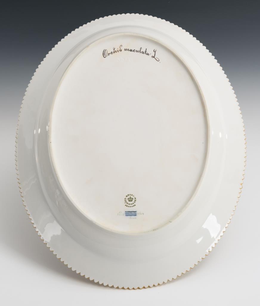Ovale Platte mit Zackenrand. Im Spiegel eine fein gemalte Knabenkraut-Pflanze, unterseitig lateinisch bezeichnet. Kratzer im Spiegel.